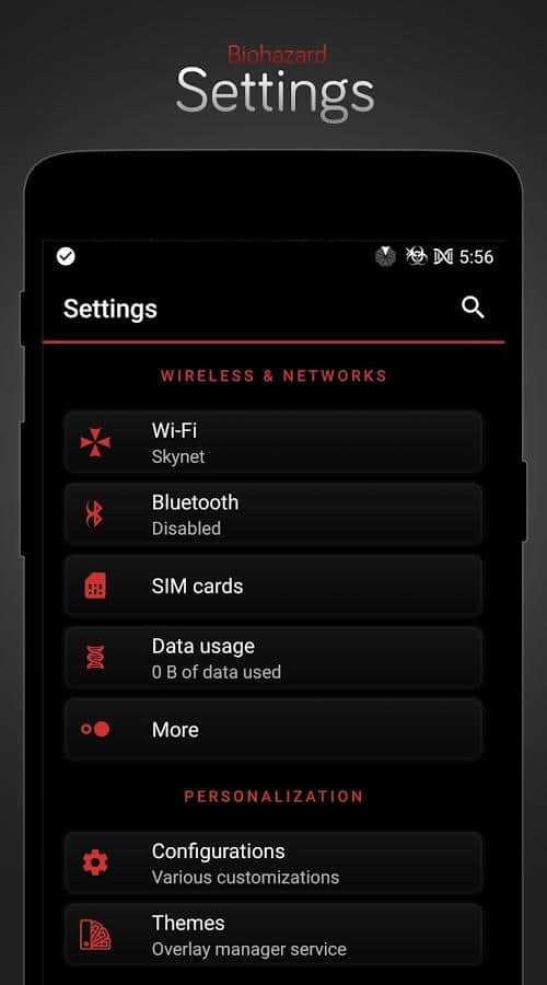 Biyolojik Tehlike Alt Tema - Eğer tüm bu standart temalardan sıkıldıysanız ve yeni bir şey istiyorsanız, bu uygulama sizin için hazırlandı. İki şık rengi, yani siyah ve kırmızıyı bir araya getirdi. Bu kombinasyon çok güzel ve canlı görünüyor, ancak aynı zamanda göz alıcı da değil. Bu tema ile sadece renk değil, aynı zamanda simgeler ve masaüstü gibi birçok detay da değişecek.