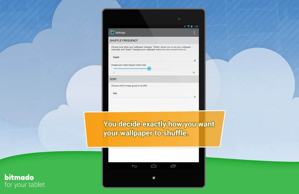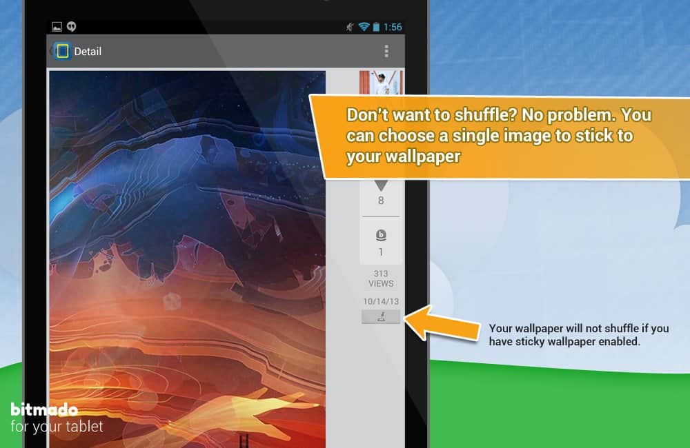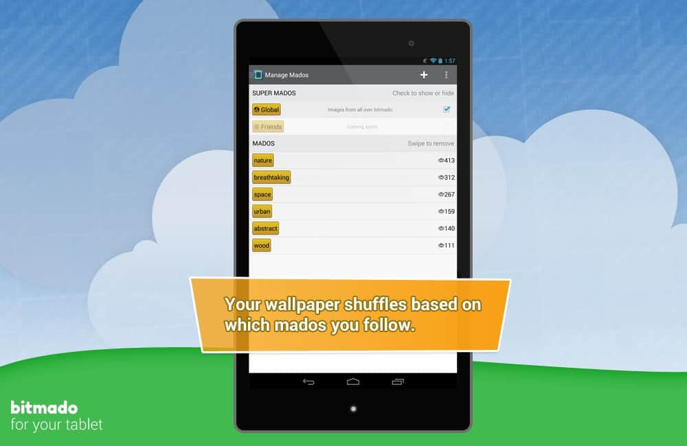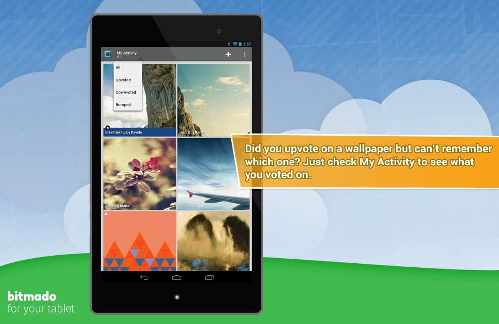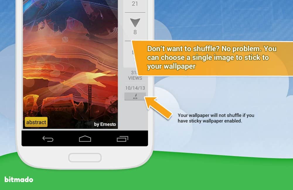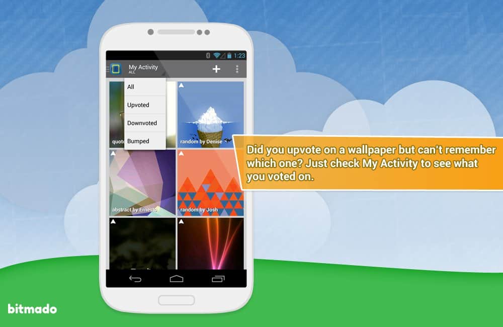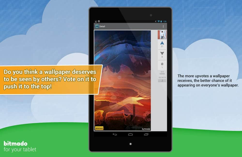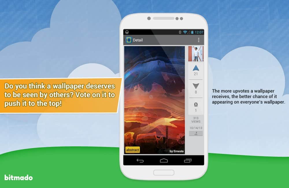 bitmado - Android için masaüstü duvar kağıtları. Ama sadece bir dizi resim değil. Bu, kullanıcıların masaüstü grafiklerine en çok oy verdikleri bir tür forumdur. Böylece en yüksek oy alan duvar kağıtlarına erişim sağlarsınız. Bunun yanı sıra, kategorilere mükemmel bir şekilde sistematize edilmiş bir arka plan katalogunu görüntüleme imkanı da bulunmaktadır. Ayrıca, etiketler şeklinde tercihlerinizi belirtebilirsiniz ve böylece size öncelikle tam olarak zevkinize en uygun olanlar gösterilecektir! Ve bir başka güzel özellik - beğendiğiniz bir resmi kolayca yükleyebilir veya parametreleri belirleyerek belirli bir zaman aralığında değişen bir duvar kağıdı alabilirsiniz!
