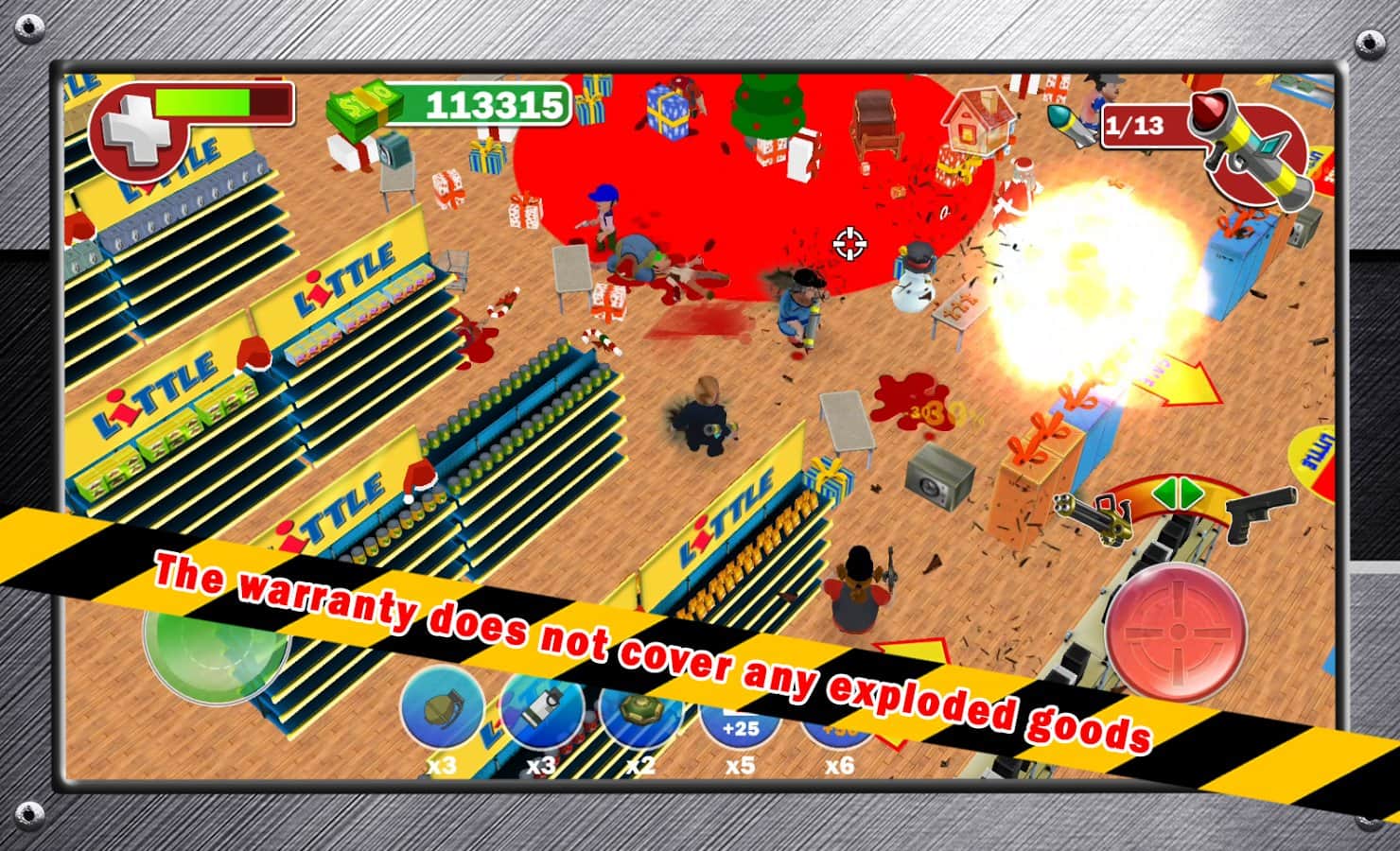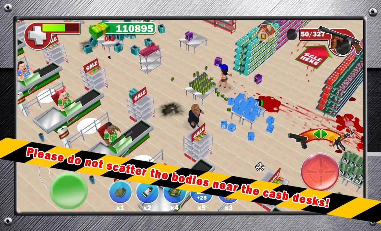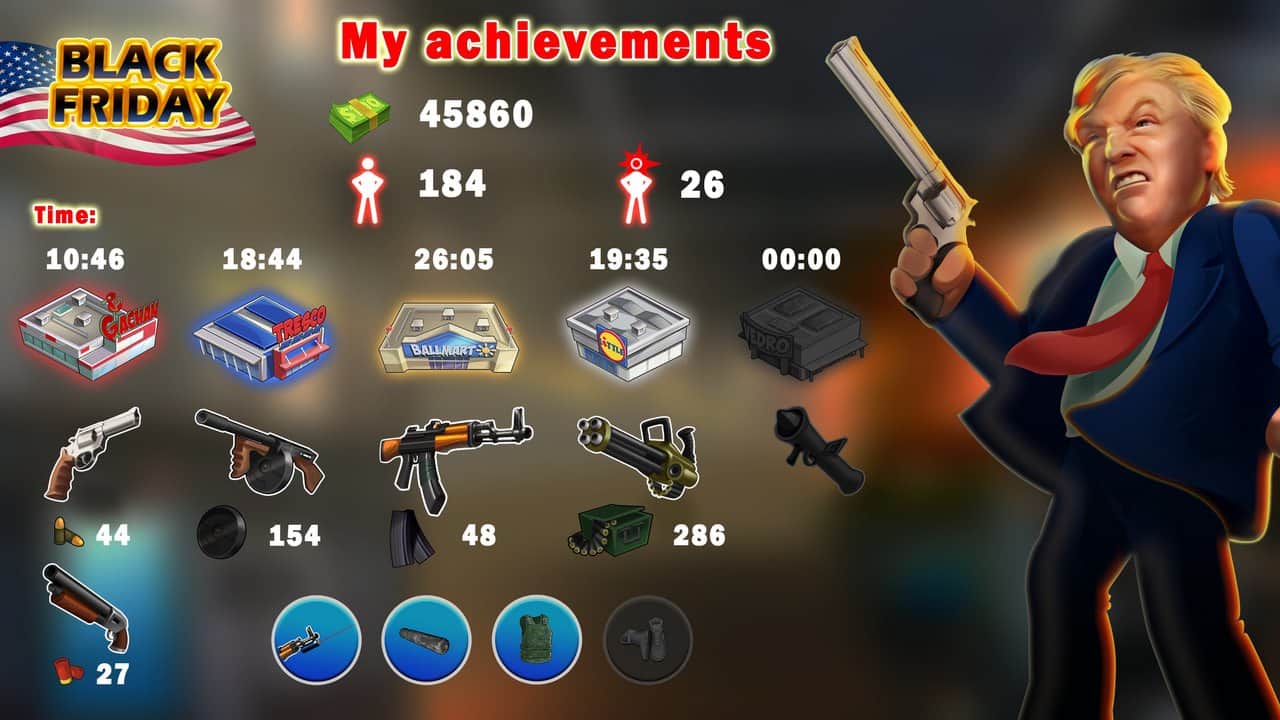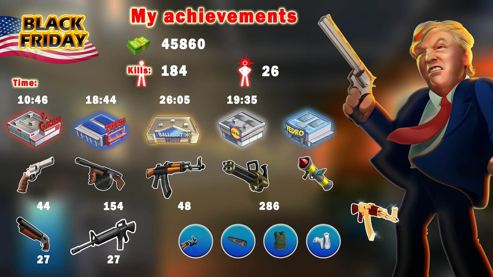 Kara Cuma – sizi büyük indirimlerin başladığı bir alışveriş merkezine götürecek bir Android oyunu. En iyi silahlarla donanıp diğer alıcılarla en iyi ürünler ve büyük indirimler için savaşın. Hızla kasaya ulaşmaya çalışan tüm rakiplerinizi yok edin ve bu gün hiçbir kurala uymayın. Düşmanlarınıza sürekli ateş edin ve geri ateşten korunmak için tezgahların ve örtülerin arkasına saklanın. En büyük indirimlerin peşine düşün ve ürünü en düşük fiyata alın. Oyun boyunca birçok güçlendirici ve bonus toplayın ve rahatsız edici alıcılardan kendinizi savunun.