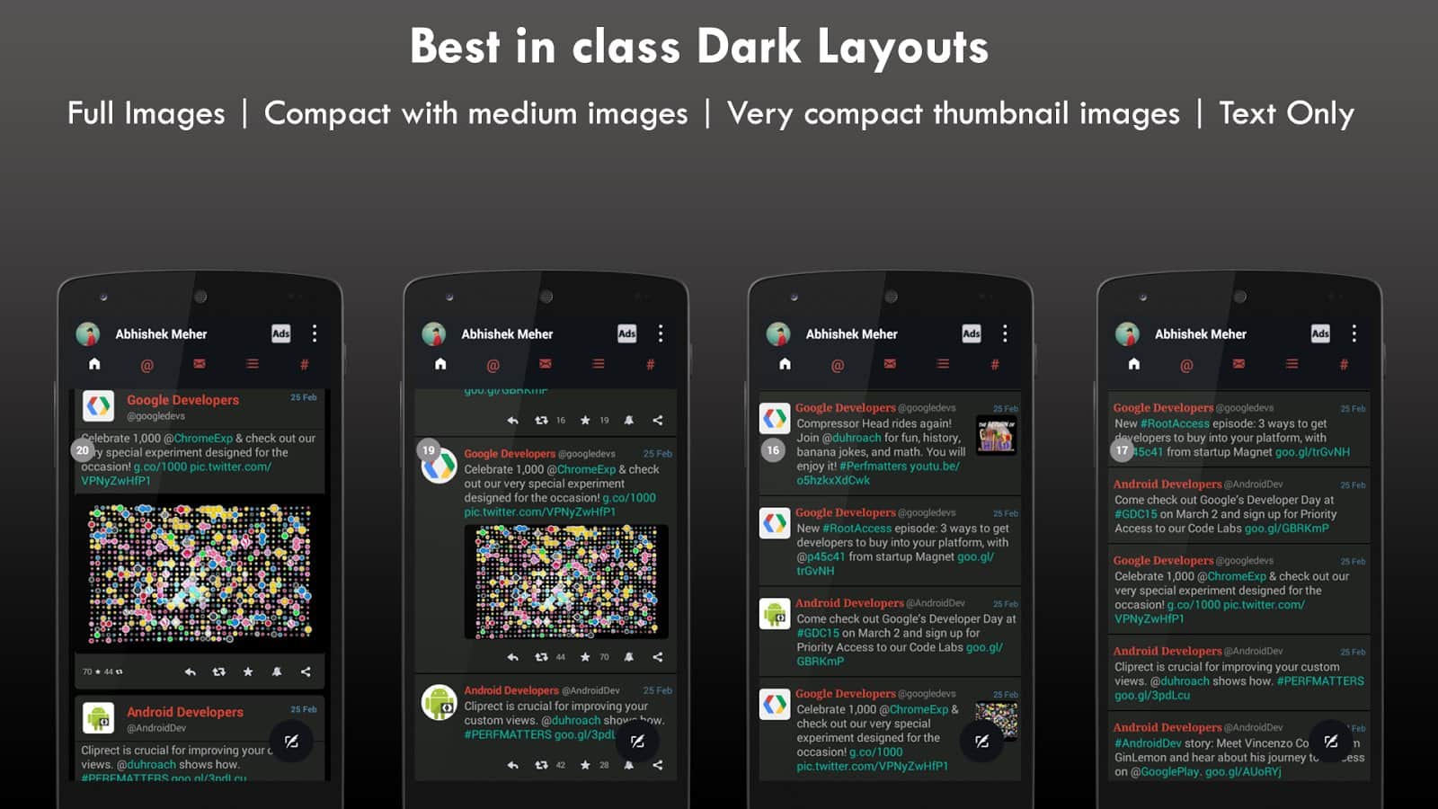 Tasarımda koyu ve açık tema seçenekleri ile tweetlerin görüntülenmesi için birkaç düzen mevcut, sizin tercihinize göre.
