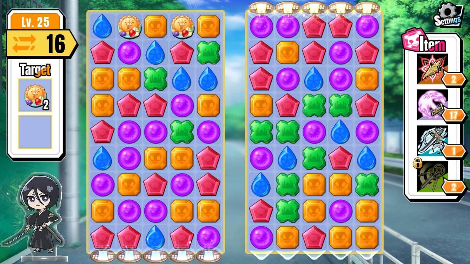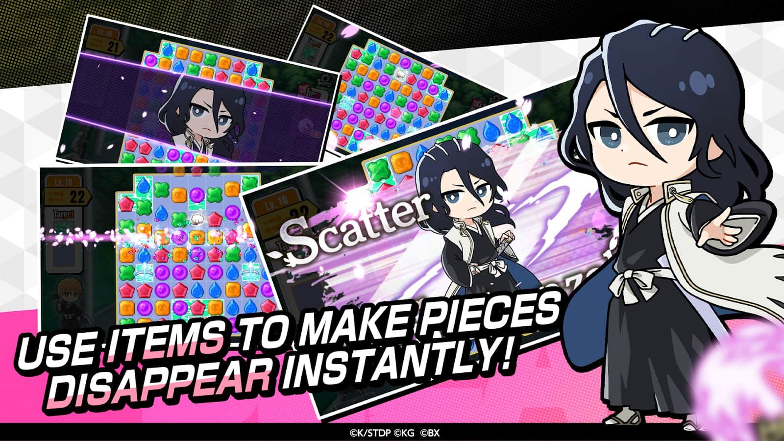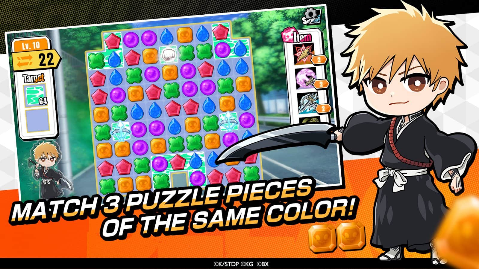 BLEACH Soul Puzzle - ünlü anime ile üçlü eşleştirme. Tüm hayranların sevdiği karakterler burada bulmacaları çözmek için toplandı. Oyun süreci oldukça basit ve kolay: aynı 3 sembolü bir sıraya yerleştirerek patlatmalı ve seviye hedefinize biraz daha yaklaşmalısınız. Ayrıca, oyun deneyiminizi kolaylaştırmak için çeşitli nesneleri de kullanabilirsiniz. Karakterleriniz için kendi odalarınızı da yapabilirsiniz. Oyun, basit ama sevimli grafikleri ve rahatsız etmeyen, sakin müziği ile süslenmiştir.