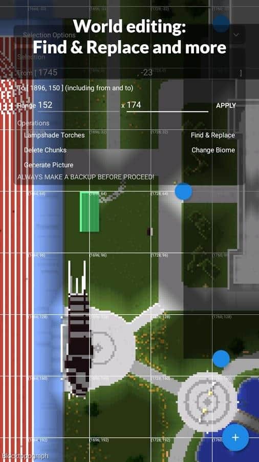 Blocktopograph programı, MinecraftPE 0.12 ~ 1.11.x oyununda gerçek bir yardımcıdır. Onunla biyomları değiştirebilir, haritayı düzenleyebilir, dünyaları görüntüleyebilir, blokları değiştirebilir vb.