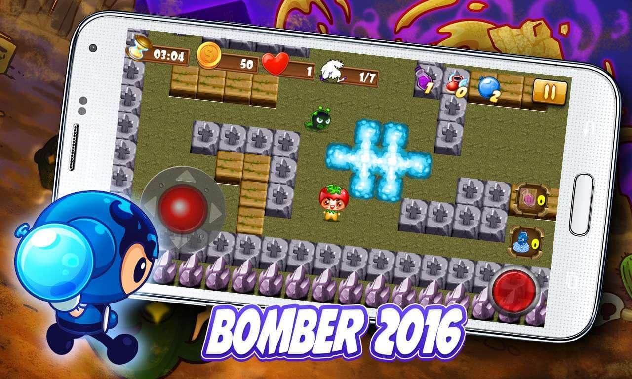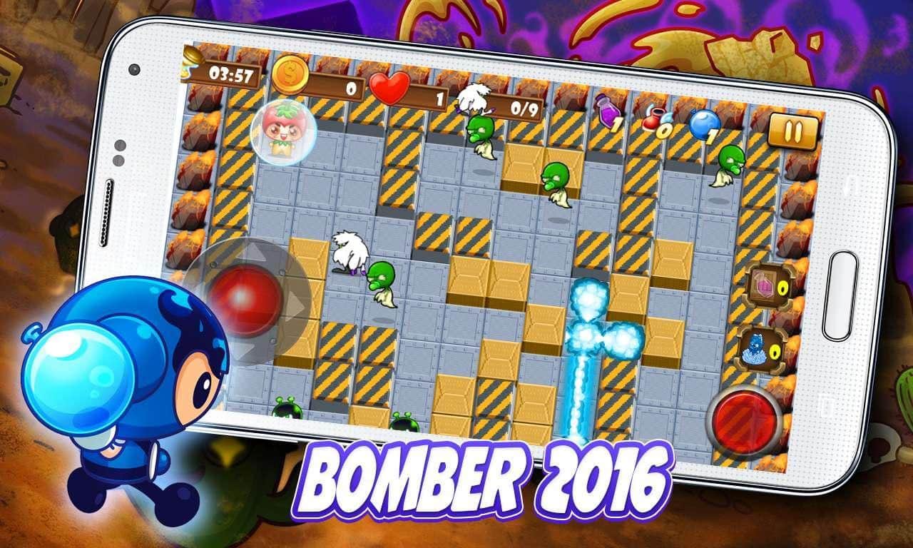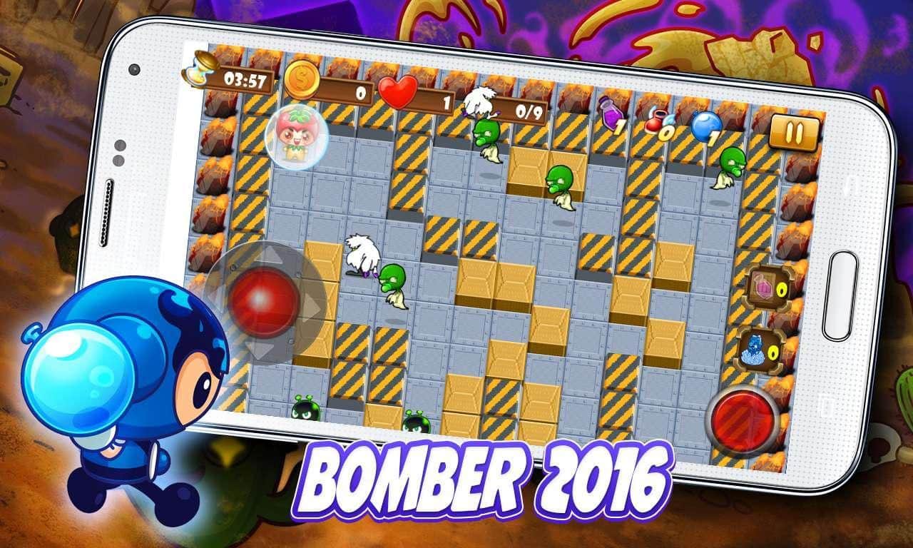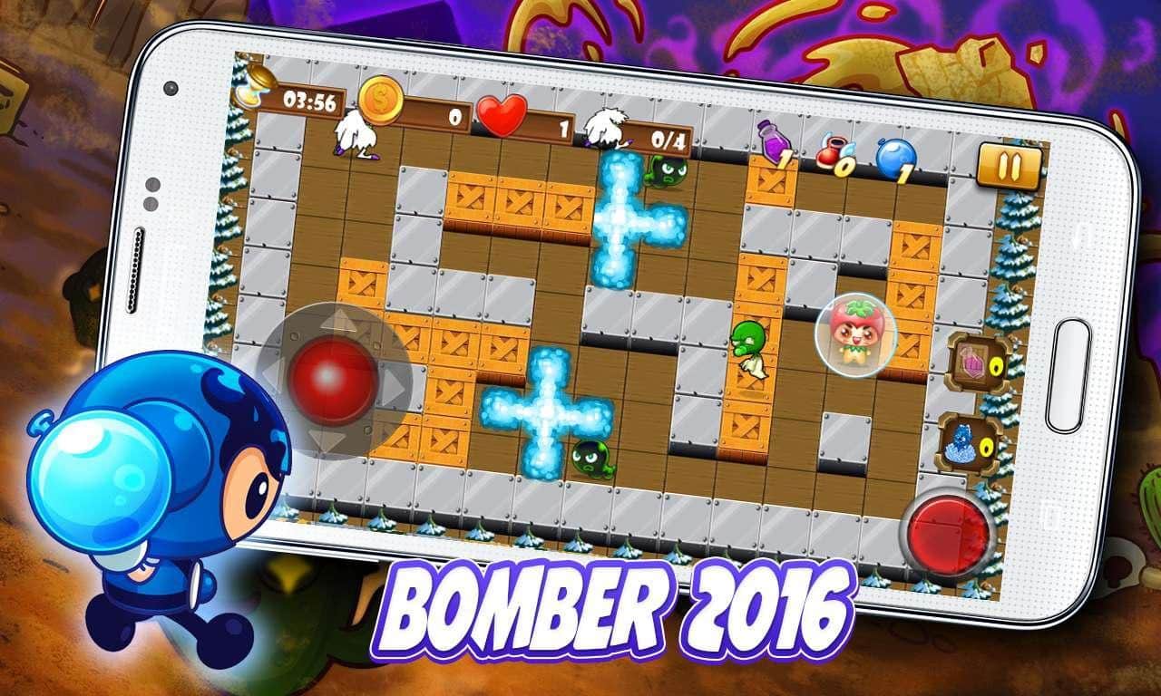 Bomber 2016 – Android için bir arcade oyunu, burada bombaları patlatan bir karakteri kontrol etmeniz gerekiyor. Oyunda çeşitli labirentlerden oluşan bir alanda bulunacaksınız, burada düşmanlar sizi bekliyor, göreviniz düşmanları yok etmek için bombaları yerleştirmek olacak. Ardışık birkaç bomba yerleştirerek combo patlamaları oluşturun. Yolda düşmanları ve engelleri patlatın, kendinize çıkış yolunu açın, ancak kahramanınızı patlatmamaya dikkat edin, aksi takdirde bir hayalete dönüşür. Patlamalardan tuğla duvarların arkasında saklanın ve kahramanınız için çeşitli kostümler ve güçlendirmeler satın alın.