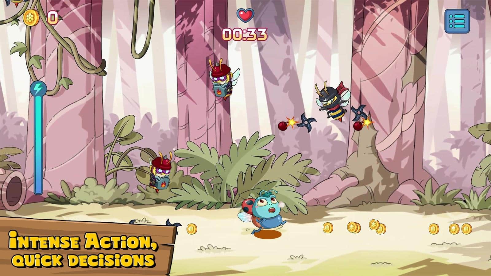 “Eşekarısı Ordusu” oyununda, böcek Jacob'un kraliçe eşekarısının intikamından ve onun sayısız ordusundan kaçmasına yardımcı olmalısınız. Düşen eşekarısı dalgalarının arasından geçin, bonusları toplayın ve bunları karakterinizin özelliklerini geliştirmek için kullanın. Reflekslerinizi geliştirin, engelleri aşın ve heyecan verici oyun deneyiminin tadını çıkarın!