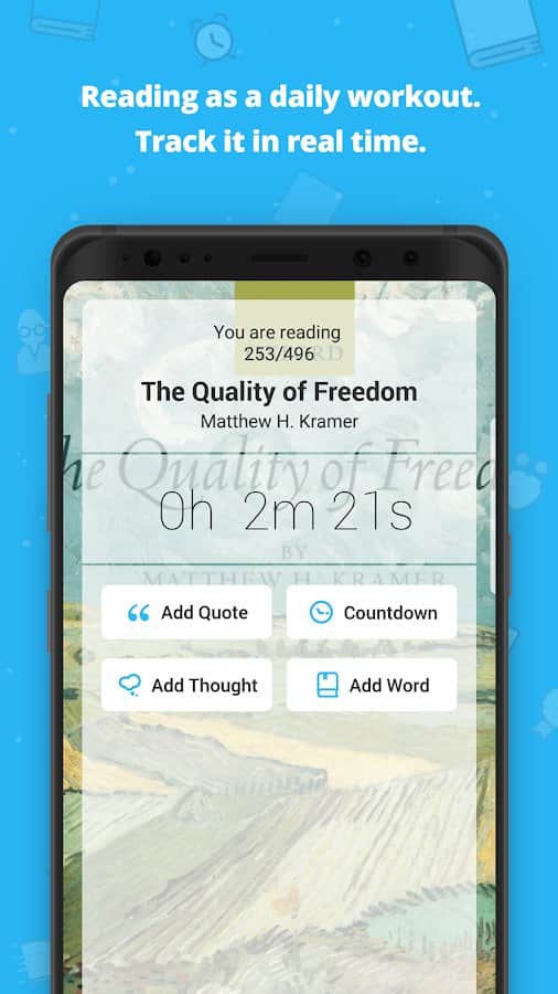 Bookly - Daha Fazla Kitap Oku uygulaması ile okuma sürecini takip edebilir ve kontrol edebilirsiniz, belirli bir zaman diliminde daha fazla okunan kitap için zamanlayıcı kullanabilirsiniz. Kitabı zamanında bitirmek için belirli bir hedef koyma imkanı vardır. Kendi ilerlemenizi ekleyin, puanınızı artırın ve okuduğunuz eserler hakkında yorumlar, incelemeler bırakın. Okuma sırasında melodileri ve çevresel sesleri dinleyin, düşüncelerinizi ifade etme tekniğiniz, okuma hızınız, en üretken günleriniz ve belirli rakamlar hakkında doğru bilgiler alın.