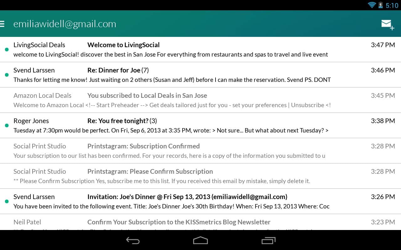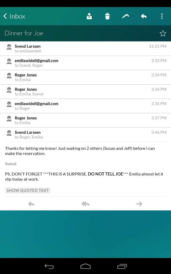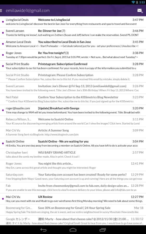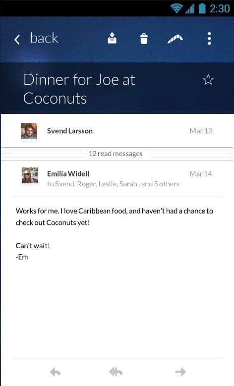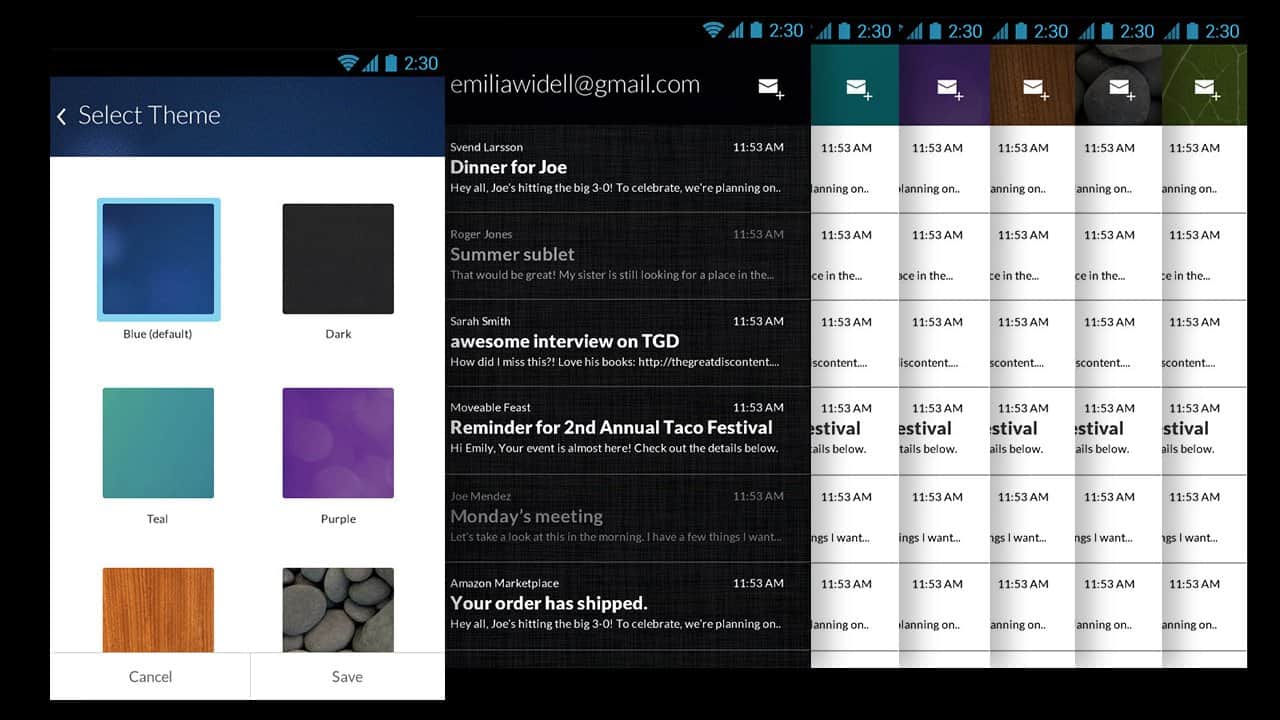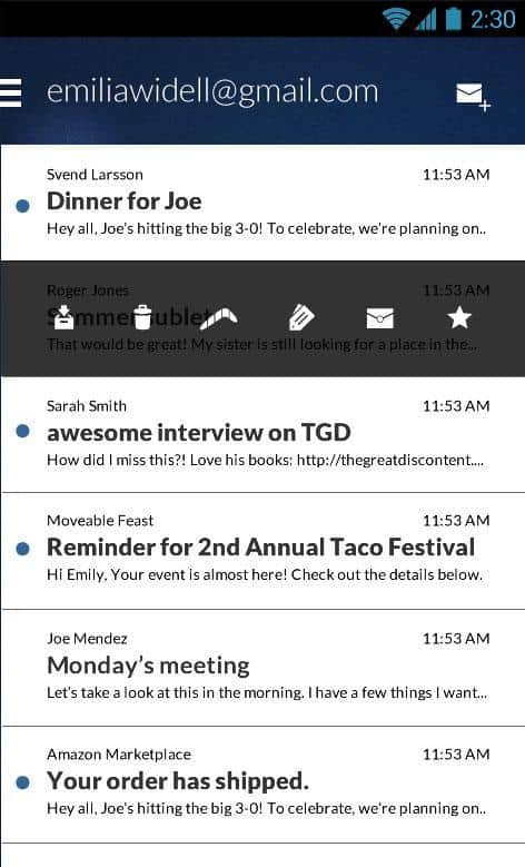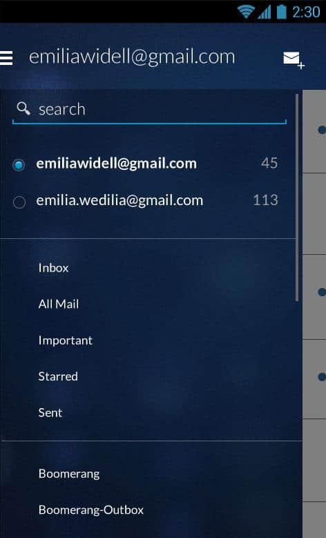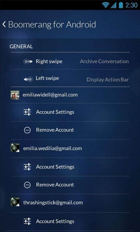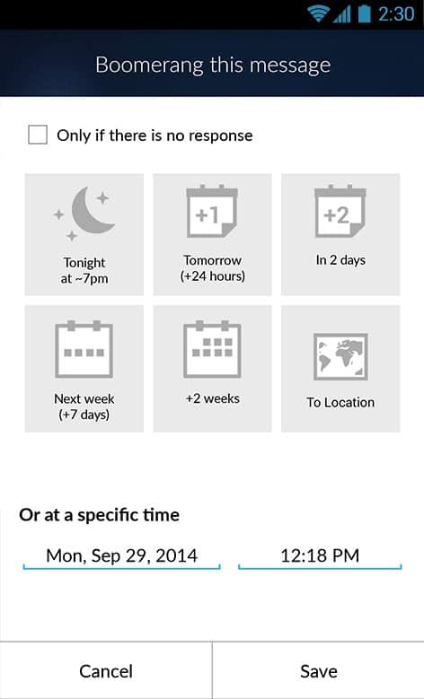 Boomerang, Gmail'in masaüstü sürümünün bir uzantısı olan Android için iyi bir e-posta istemcisidir. Boomerang, e-posta için çeşitli temaları destekler, oldukça işlevseldir ve belirli bir süre, gün, hafta, ay vb. sonra e-postayı tekrar alma özelliğine sahiptir. Bu özellik sayesinde önemli işler veya yaşam anlarını kaçırmazsınız! İyi kullanım!