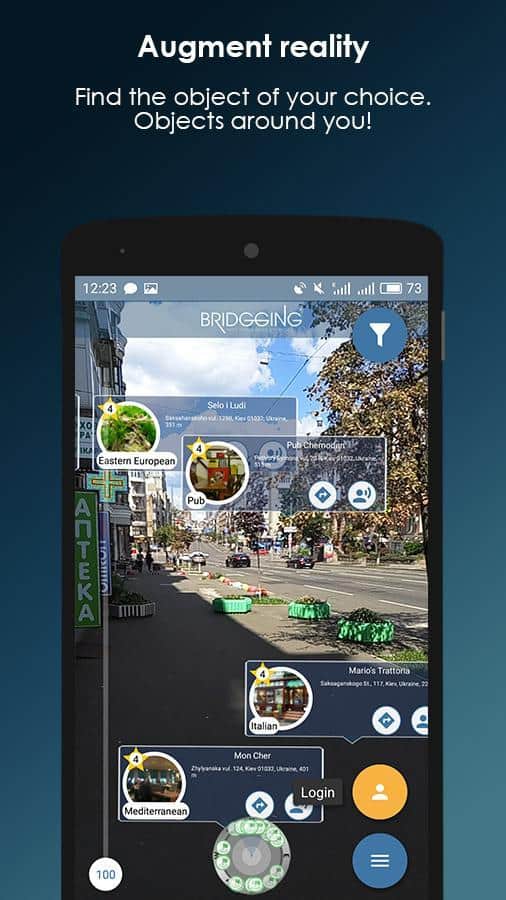 Bridgging, mobil cihazınızdaki kamera modunda çevrenizdeki ilginç nesnelere dikkat çekmenizi sağlar. Artık her seyahat eden, yakındaki bir kafeyi kolayca bulabilecek ve bir şeyler atıştırabilecektir. Ayrıca, göz alıcı bir mimari anıtı asla kaçırmayacak ve onu en küçük detaylarıyla inceleyebilecek. Dahası, uygulama kullanıcının bu nesne hakkında kendi fotoğrafını ve yorumunu eklemesine olanak tanır. Kendi nesnenizi veya rotanızı listeye ekleyebilir, diğer seyahat edenlerin eklediği rotaları görebilirsiniz. Şehir içinde büyüleyici bir tur yapmanıza yardımcı olacak "sesli rehber" fonksiyonu ve belirli bir güzergah ayarlama seçeneği de bulunmaktadır.