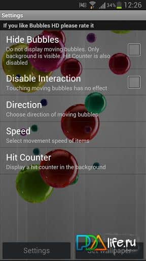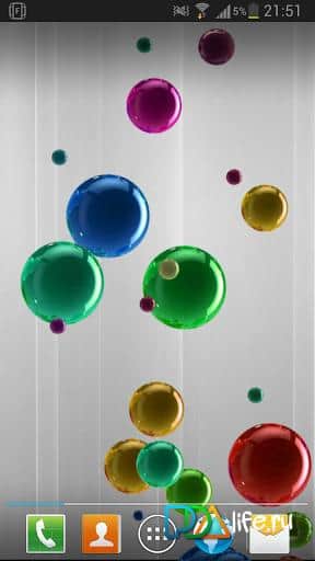 Bubbles HD Canlı Duvar Kağıdı – Lipton geliştiricisinden Android için güzel canlı duvar kağıtları, ekranınızda dokunuşla patlayacak renkli baloncuklar şeklinde. Ayar seçenekleri arasında: baloncukların hareket yönü ve hızı, baloncukların patlama animasyonunu devre dışı bırakma ve ayrıca animasyonu tamamen devre dışı bırakma gibi seçenekler bulunmaktadır.