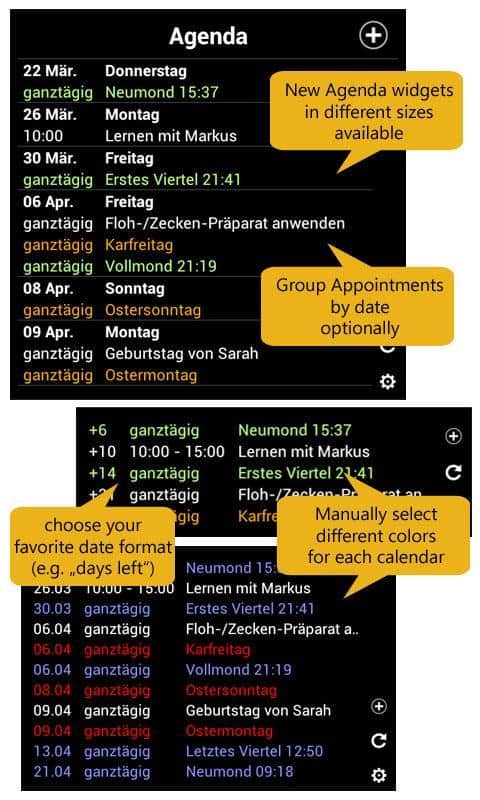 Uygulama, takvimin farklı tasarım seçenekleri, çeşitli boyutlarda widget'lar ve farklı kaynakların renkli gösterimi gibi birçok seçenek sunmaktadır.