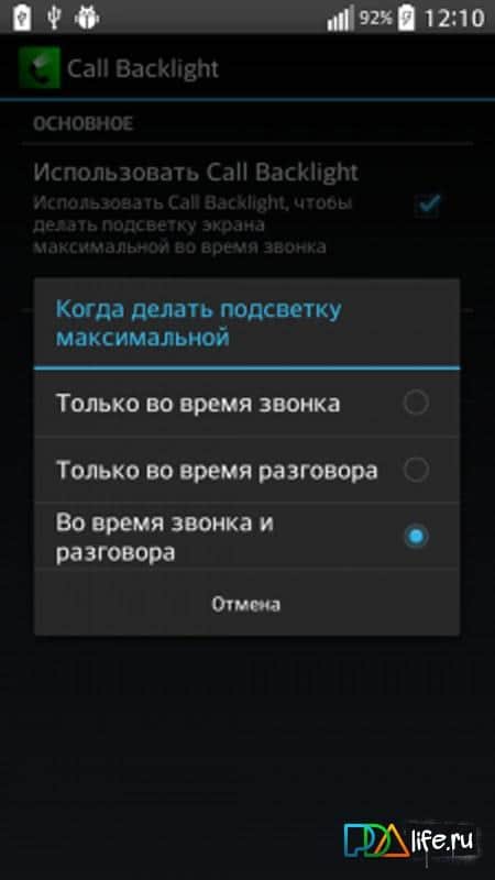 Çağrı Arka Işığı – dışarıda bir arama aldığınızda, cihazınızın ekranına gözlerinizi zorlamak zorunda kalmayacaksınız, çünkü bu uygulama akıllı telefonunuza arama ve telefon görüşmesi sırasında maksimum aydınlatmayı sağlayacaktır. Bu arada, yakınlık sensörünün devreye girmesi durumunda ekranı kapatacağını ve görüşme sona erdiğinde aydınlatma seviyesinin başlangıç değerine döneceğini belirtmek gerekir. Çağrı Arka Işığı, yalnızca gerekli ayarları içerir ve düşük bir boyuta sahiptir.