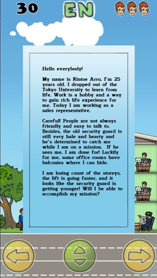 Caramba! – genç bir adam olan Kntoe Arro'ya görevini tamamlamasında yardımcı olmanız gereken Android için bir heyecan verici oyun. Kahramanımız, para kazanmak için üniversitesini bırakan genç bir öğrencidir. Kntoe, maaşı büyük müşteri sayısına bağlı olan bir ticaret ajanı olarak çalışıyor. Müşterilerini bulmak için, memur dolu ofislere gidiyor. Dikkatli olun, herkes bu tür çalışanlara dostça yaklaşmayabilir ve onlarla iletişim kurmak istemeyebilir. Ayrıca, sizin varlığınızı da sevmediği için eski bir güvenlik görevlisi peşinize düşecektir. Kahramanınız, balkona veya asansöre saklanabilir. Her yeni seviyede, kat sayısı artacak ve güvenlik görevlisinin hızı da artacaktır.
