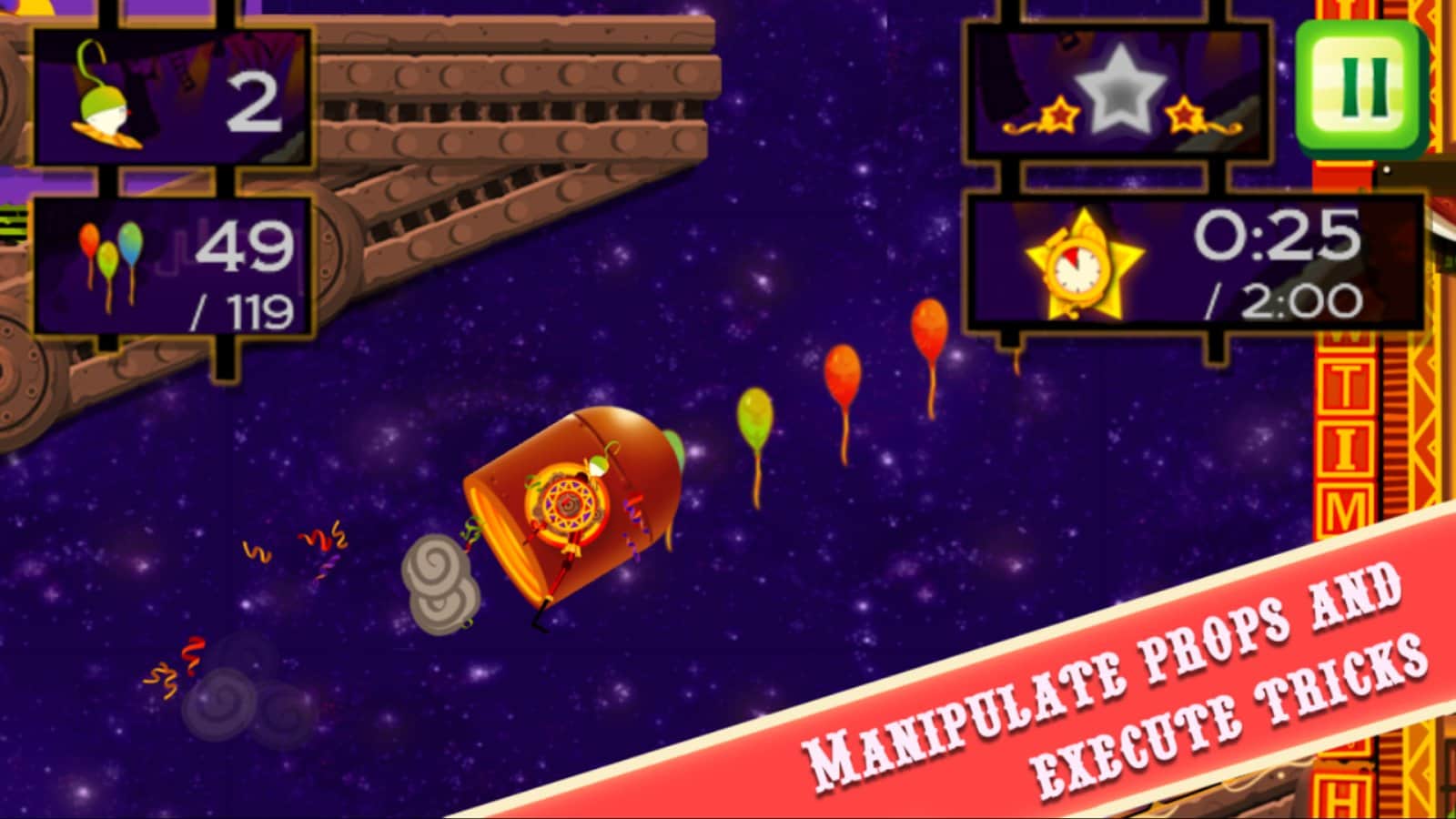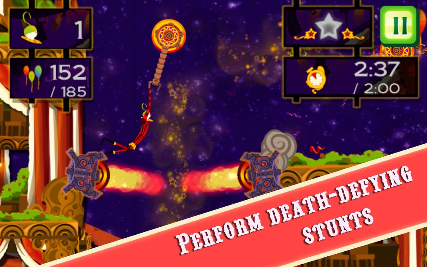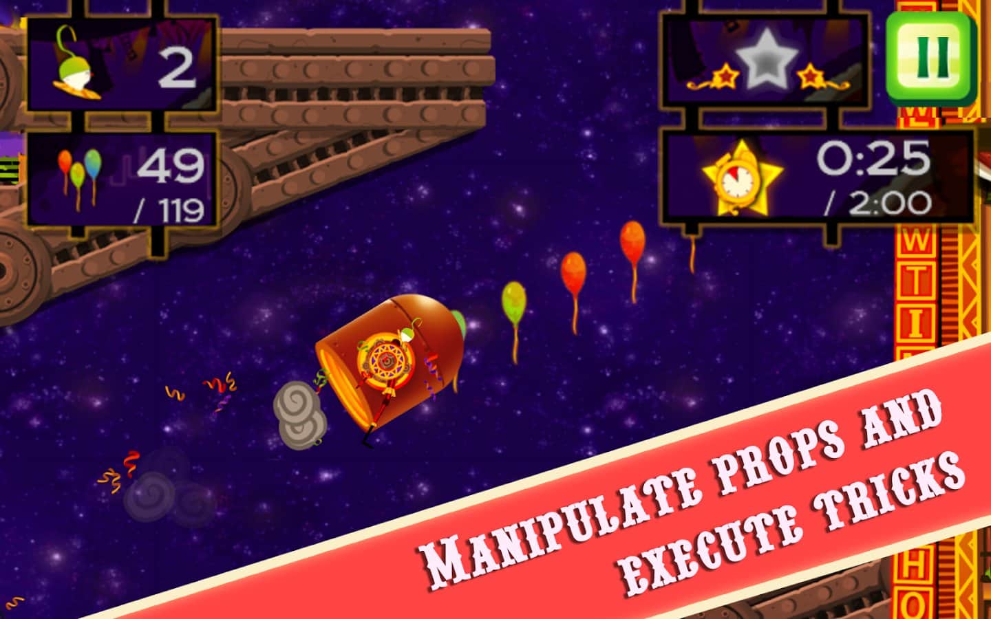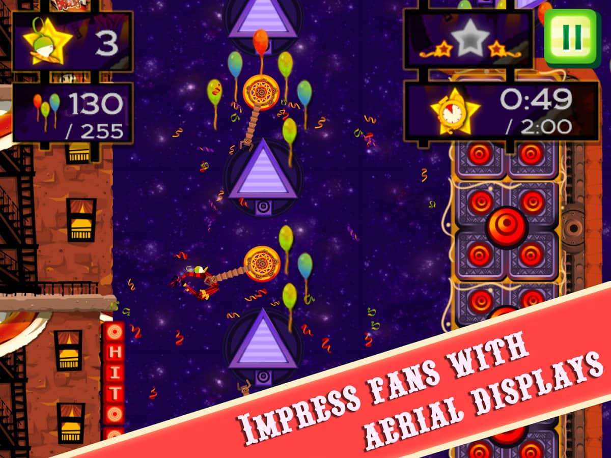 CarneyVale: Showtime – ölümle yüzleşen ve tehlikeli numaralar yapan cesur bir akrobatı kontrol altına alın. Bu oyun, akrobatı bir platformdan diğerine hareket ettirmeniz gereken fizik tabanlı bir oyundur; tüm balonları toplamak ve seviyeyi mümkün olan en kısa sürede tamamlamak için elinizden geleni yapmalısınız. Zıplayın, taklalar atın ve ateş halkalarından geçerken seviyede gizli yıldızları bulmaya çalışın. Tehlikeli seviyeleri geçin ve tüm hayatlarınızı kaybetmeden zorlu görevleri tamamlamaya çalışın. Telefonunuzda gerçekleşecek inanılmaz epik aksiyonların tadını çıkarın ve en deneyimli akrobat olun.