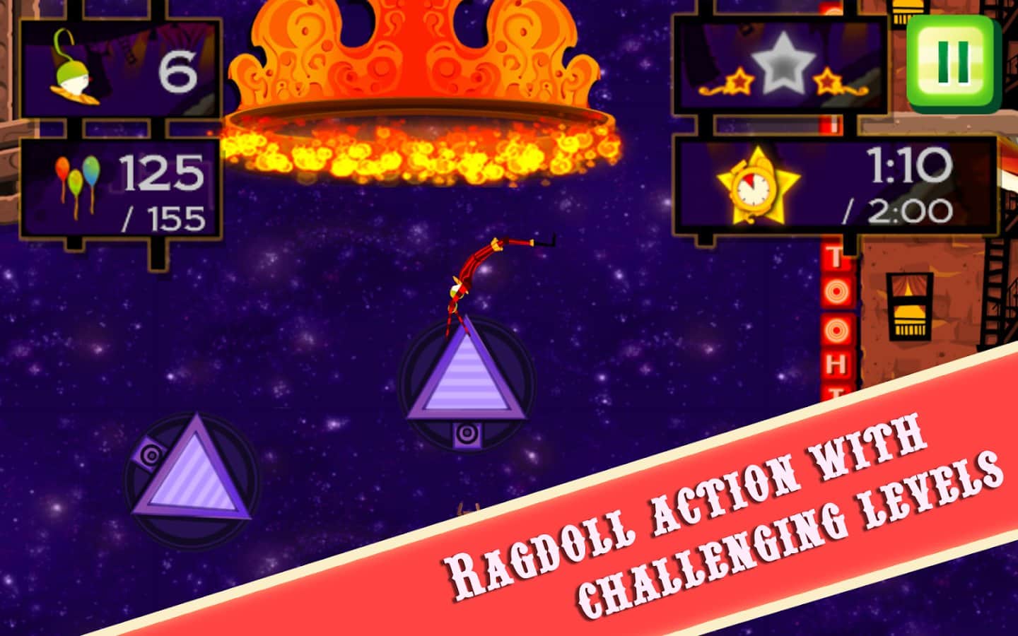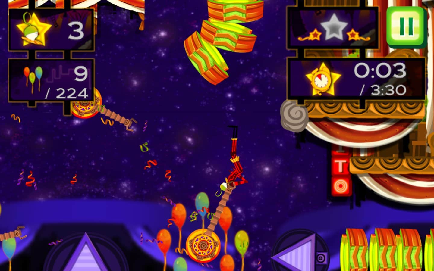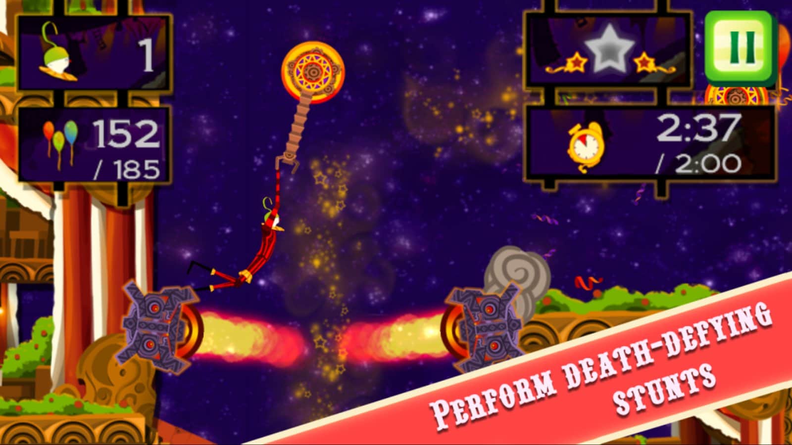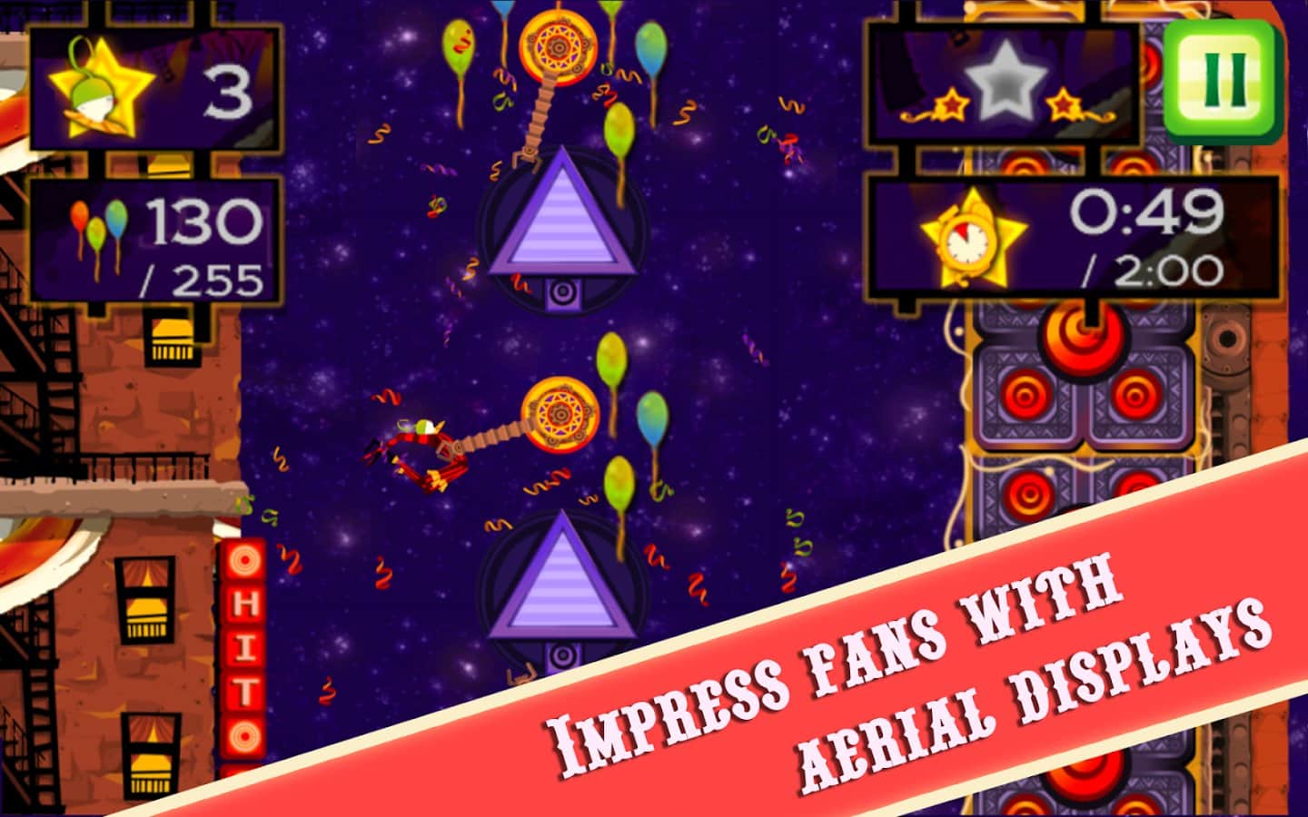 CarneyVale: Showtime – ölümle yüzleşen ve tehlikeli numaralar yapan cesur bir akrobatı kontrol altına alın. Bu oyun, akrobatı bir platformdan diğerine hareket ettirmeniz gereken fizik tabanlı bir oyundur; tüm balonları toplamak ve seviyeyi mümkün olan en kısa sürede tamamlamak için elinizden geleni yapmalısınız. Zıplayın, taklalar atın ve ateş halkalarından geçerken seviyede gizli yıldızları bulmaya çalışın. Tehlikeli seviyeleri geçin ve tüm hayatlarınızı kaybetmeden zorlu görevleri tamamlamaya çalışın. Telefonunuzda gerçekleşecek inanılmaz epik aksiyonların tadını çıkarın ve en deneyimli akrobat olun.