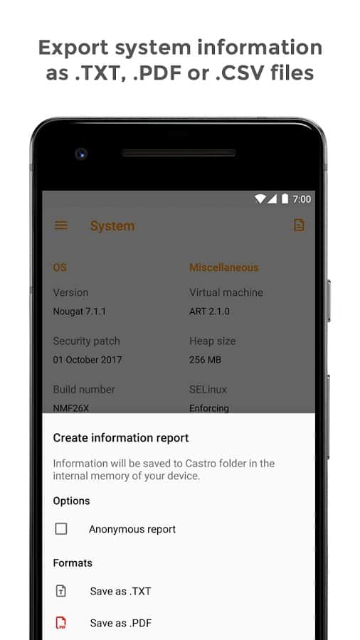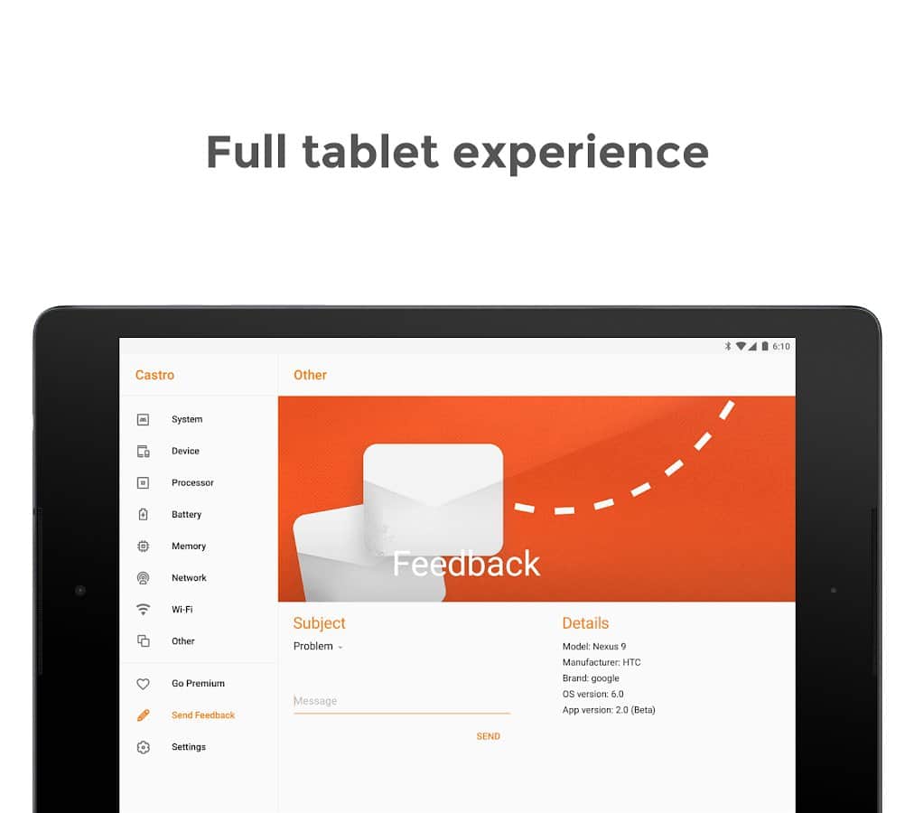 Akıllı telefonunuzda neyin nasıl çalıştığını daha iyi anlamak için tüm olası göstergeleri kontrol altında tutmak gerekir - bu, gelecekte sorunlardan kaçınmanıza veya sorunlar meydana geldiyse, sistemi daha hızlı bir şekilde düzene sokmanıza yardımcı olacaktır. Castro, işlemcinin yükünü ve temel özelliklerini, RAM ve sabit bellek durumunu, mobil ağlarla ilgili verileri, Wi-Fi, bataryanın durumunu ve olası ısınmasını ve daha fazlasını gerçek zamanlı olarak gösterir. Arayüz, evrensel malzeme tasarımında yapılmıştır.