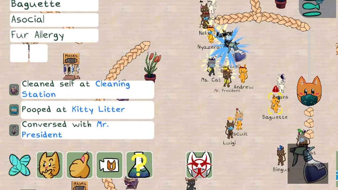Tamamen farklı kedilerden oluşan bir koloni geniş uzaya gitti, ancak bir felaket meydana geldi ve gemide garip bir virüs yayılmaya başladı. Hastalığı tamamen ortadan kaldırana kadar karantina uygulamalısınız. Kedilere koruyucu maskeler ve kalkanlar dağıtın, hastaları bulmaları için talimatlar verin, düzenli testler yapın, enfekte olanları izole odalara gönderin, titiz dezenfekte işlemleri gerçekleştirin ve her hayvanın sağlığını takip edin. Ana görevleri başarısız olana kadar tüm kedileri korumaya çalışın.