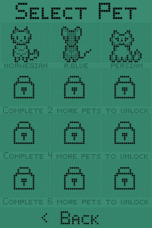 Catgotchi: sanal kedi. 90'lar tarzında yapılmış retro bir oyun. Kedilere bakmanız gerekiyor ve başlangıçta üç ırk mevcut: İran, Norveç ve Rus Mavi. Seçim yaparken evcil hayvanın rengini de seçebilirsiniz. Başarılı bir geçiş için kedinin her zaman tok olmasına, sürekli oynamaya ve temizlemeye dikkat etmelisiniz. İki kedi olgunluk çağına ulaştığında, size başka üç ırk daha açılacak ve böylece toplam 12 ırkı açabileceksiniz. Diğer bir özellik ise, her ırkın kendi mini oyunlarının olmasıdır.