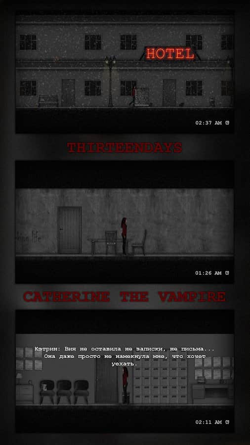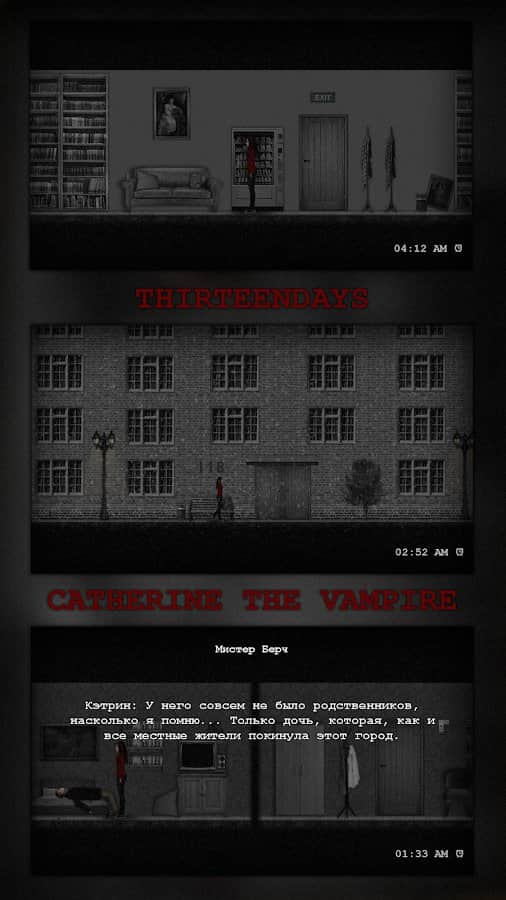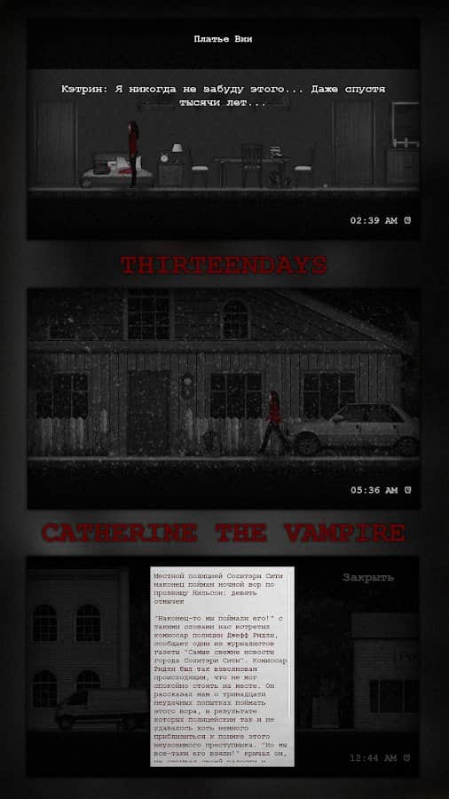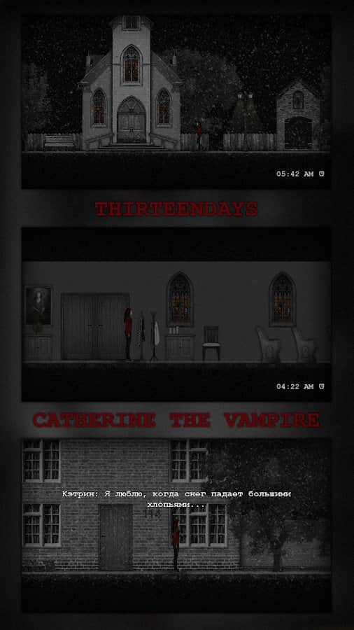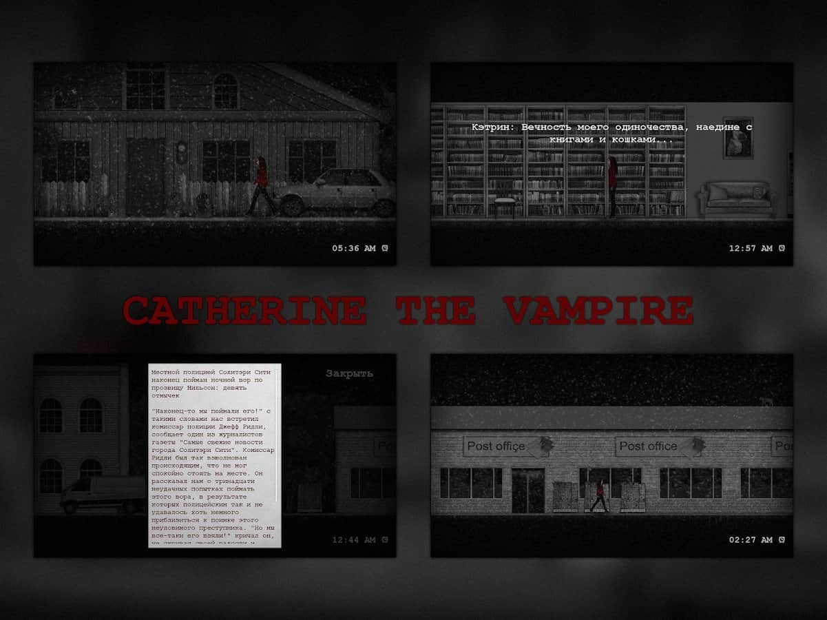KEDİ KATİNE – Android için eğlenceli bir macera oyunu, burada yalnız bir vampir rolünü üstleneceksiniz. Bu oyunda, küçük bir şehirde yaşayan Katerina adında bir vampirin rolünü oynayacaksınız. Gece uyanan kahramanımız, kan susuzluğunu gidererek insanları avlardı. Ancak, Katerina'nın yaşadığı şehirde uzun yıllardır tek bir ruh bile yok, sanki kıyamet kopmuş ve herkes yok olmuş. Bu oyunda çeşitli görevler ve misyonlar gerçekleştirerek bir vampirin hayatından bir gece yaşayacaksınız. Uzun zamandır tanıdığınız şehirde dolaşın ve içinde hayatın kaynadığı geçmiş günleri hatırlayın.