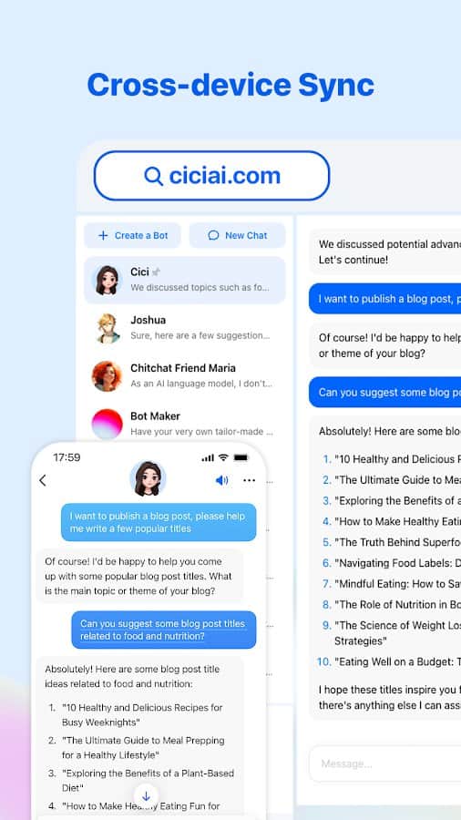 Cici - bu, hayatınızda kolaylık ve verimlilik sağlamak için en akıllı botu sunan yapay zeka tabanlı kişisel asistanınızdır. Bu benzersiz uygulama, çeşitli durumlarda size yardımcı olabilecek güvenilir ve zeki bir asistan sahibi olmak isteyen kullanıcılar için tasarlandı. Bot, yalnızca ihtiyaçlarınız ve hayal gücünüzle sınırlı olan geniş bir olanaklar yelpazesini sunar. Cici’yi, problem çözme, sınavlara hazırlık ya da sadece bilginizi genişletmek için öğrenim hayatınızda kullanabilirsiniz. Ayrıca, farklı konularda bilgi sunarak ve sorularınıza yanıt vererek merakınızı gidermede de faydalı olabilir. Cici, uyum yeteneği sayesinde iletişim tarzını sizin özelliklerinize göre uyarlayarak rahat ve doğal bir etkileşim sağlamaktadır.