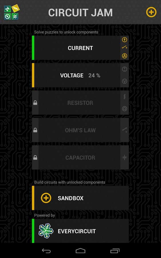 Devre Jam - bu oyundaki amaç oldukça basit, her seviyenin görevine uygun devreler inşa etmelisiniz. Bunun için direnç, kondansatör, lamba, anahtar, düğme, voltaj kaynağı, akım kaynağı, voltmetre, ampermetre, ohmmetre gibi çeşitli bileşenlerden oluşan bir setiniz olacak. Elbette başlangıçta bunlar kapalı olacak ve oyun ilerledikçe bunları açabileceksiniz. Bu oyun hem yetişkinler hem de birçok şey öğrenebileceğiniz çocuklar için uygundur.
