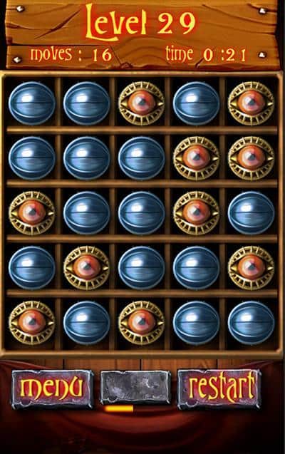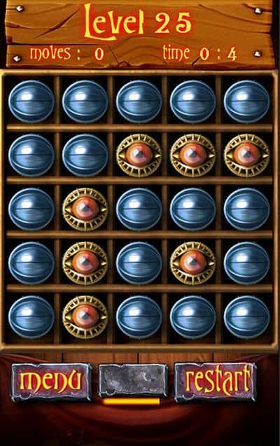 CloseEyesPuzzle – Android için hazırlanmış, mistik grafiklerle dolu eğlenceli bir bulmaca. Buradaki ana hedefiniz, tüm gözleri kapatmaktır. Alan üzerinde açık ve kapalı gözler yer almakta ve sizin göreviniz, gözlerin durumuna bağlı olarak onları tıklayarak kapatmaktır. Gözlerin yanındaki hücreler açılacak veya kapanacaktır. Seviyeyi geçmek için tüm gözleri kapatmalısınız; eğer bunu başaramazsanız, atla butonuna basarak bir sonraki seviyeye geçebilirsiniz, ancak puan kazanamazsınız. 60 eşsiz seviyeyi geçmeyi ve mümkün olduğunca çok puan kazanmaya çalışın.