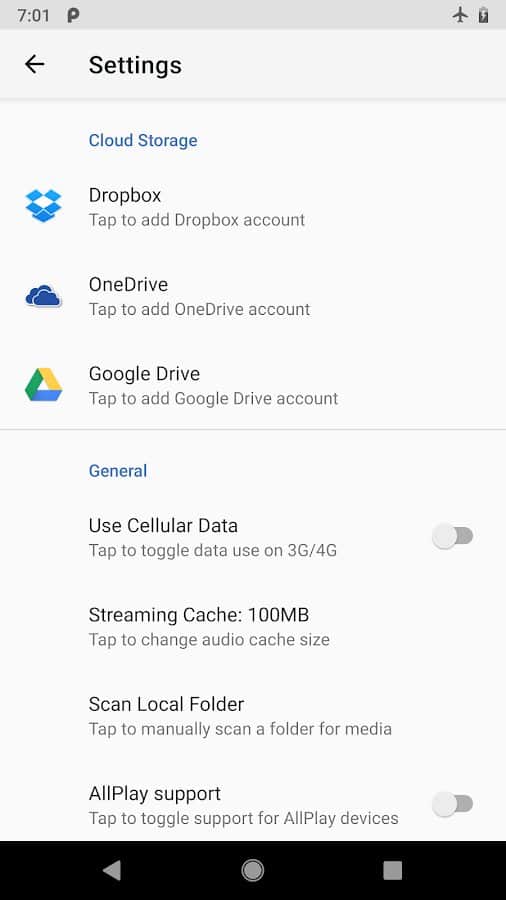 Tüm müzik kütüphaneniz birden fazla cihazda sıralanmış veya bir veya daha fazla bulut depolama alanında saklanıyor ve sevdiğiniz şarkıyı hemen dinlemek istiyorsunuz ama erişiminiz yok. Tanıdık bir durum mı? Kesinlikle. doubleTwist'in yaratıcılarından yeni çalar, bu durumla başa çıkmanıza yardımcı oluyor. Uygulama bağlı bulut disklerini tarar (şu anda yalnızca Dropbox, OneDrive ve Google Drive desteklenmektedir) müzik dosyaları açısından ve bunları çalar. En değerli olanları çevrimdışı olarak saklayabilirsiniz. Parça sayısında herhangi bir sınırlama yok. Çalar, Material Design konsepti ile uyumlu olarak tasarlanmıştır ve çaların temel işlevlerini, kapak resimlerini arama, sanatçı bilgisi, Last.FM'de scrobbling gibi tüm temel işlevleri içerir.