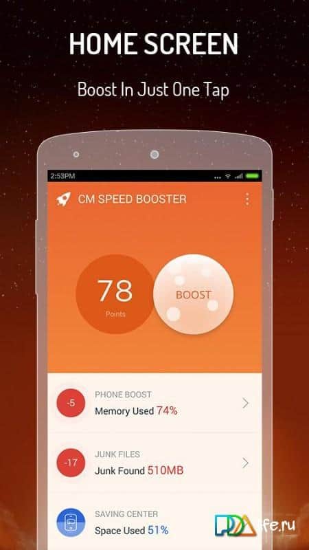 Popüler Clean Master'ın yaratıcıları, izleyicilerini bir başka optimizasyon aracıyla mutlu etmeye karar verdiler. CM Hızlandırıcı, telefonu atıklardan ve gereksiz işlemlerden hızlı (yaratıcıların iddialarına göre rakiplerinden daha hızlı) ve etkili bir şekilde temizlemenizi sağlar. Uygulama, önbelleği etkili bir şekilde temizler, daha önce silinmiş programların kalıntılarından kurtulmanızı sağlar, bu da cihazın belleğini verimli kullanmanıza yardımcı olur ve gereksiz arka plan işlemlerini sonlandırarak pil ömrünü uzatır ve işlemciyi rahatlatır. Kullanıcının katılımı neredeyse gereksizdir — temizlik, kelimenin tam anlamıyla bir dokunuşla gerçekleşir.