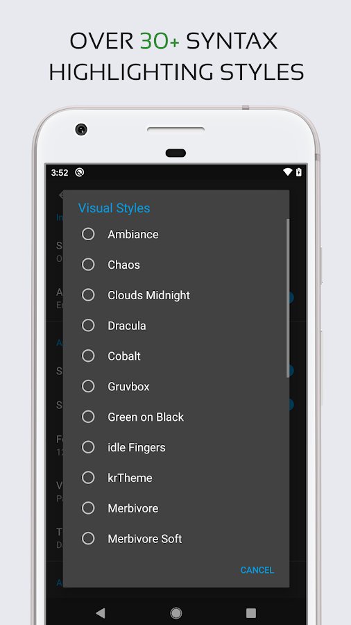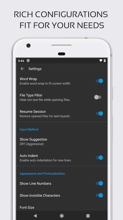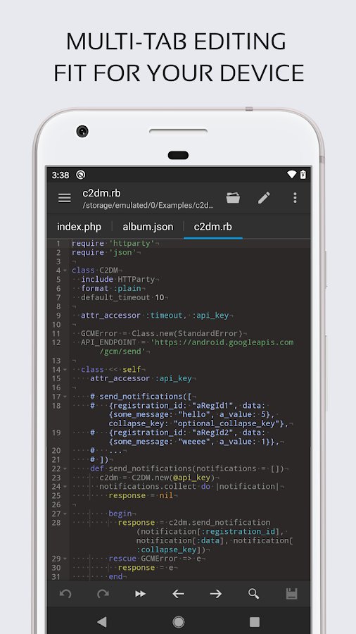 Code Editor uygulaması sayesinde, kodlama fonksiyonları, renkli sözdizimi vurgulama, otomatik girinti ve tamamlama özelliklerine sahip optimize edilmiş ve tamamen hazır bir metin editörü elde edebilirsiniz. Editör, yaklaşık 110 farklı kodlama dilini destekler, aynı anda birden fazla sekme arasında geçiş yapmanıza, ilerlemenizi düzenleyip kaydetmenize, gerekli sütunları vurgulamanıza ve daha fazlasına olanak tanır. Önizleme ile birlikte FTP, FTPS, SFTP ve WebDAV üzerinden dosyalara erişim sağlayabilir, fiziksel klavye desteği ve seçim için üç farklı tema ile birlikte kullanabilirsiniz.