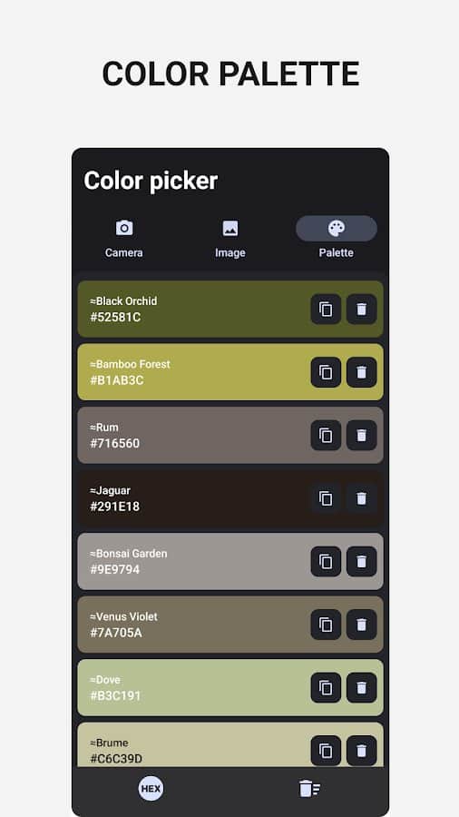 Renk seçici - Amaç doğrultusunda, manuel olarak seçtiğiniz rengin metin kodunu almak için damlalığı kullanın. Bunu gerçek zamanlı bir görüntü ile veya yüklenmiş bir resim ile yapabilirsiniz. En temel renkler otomatik olarak palete taşınır, burada kodları kopyalayabilir ve bu renkleri yeniden kullanabilirsiniz. Eğer paletten temel tonları görmek istemiyorsanız, damlalığı gerekli alana kaydırın ve aşağıdaki bilgileri kontrol edin. Uygulama CMYK, HEX, RGB, HSV, HSL, XYZ formatlarını destekler.