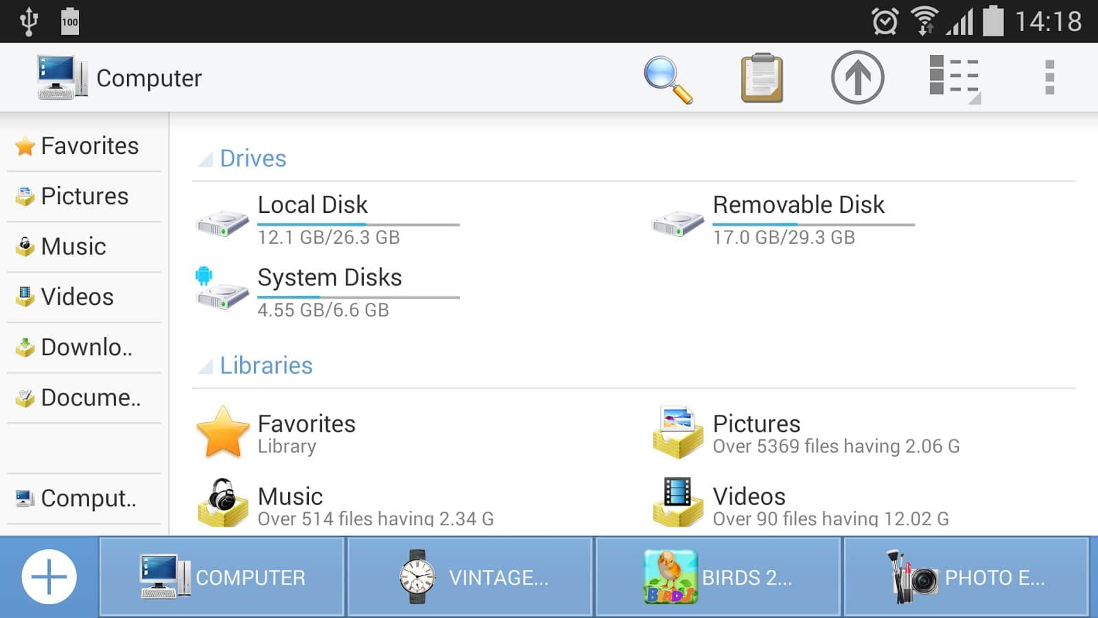 Bilgisayar - Windows XP ile «benim bilgisayarım» dosya yöneticisinin neredeyse aynı kopyasıdır. Klasörleri standart olarak büyük simgeler, küçük simgeler ve tablo şeklinde görüntüleyebileceksiniz (isteğinize göre ayar yapabilirsiniz). Yöneticiden çıkmadan dosyaları görüntüleme ve açma imkanı vardır. Dosyaları kopyalama ve taşıma işlemlerini kolaylaştırmak için uygulama "hepsini seç" ve "seçim" butonlarına sahip olup, çoklu dokunuş ile (klasöre dokunduğunuzda açılmaz, seçilir). Ayrıca arşivlerle çalışma imkanı ve birçok yaygın formatı destekleyen yerleşik bir görüntüleyici de mevcuttur. Elbette program, anlaşılır ve oldukça hoş bir arayüze sahip olup, bu da onun cazibesini artırmaktadır.