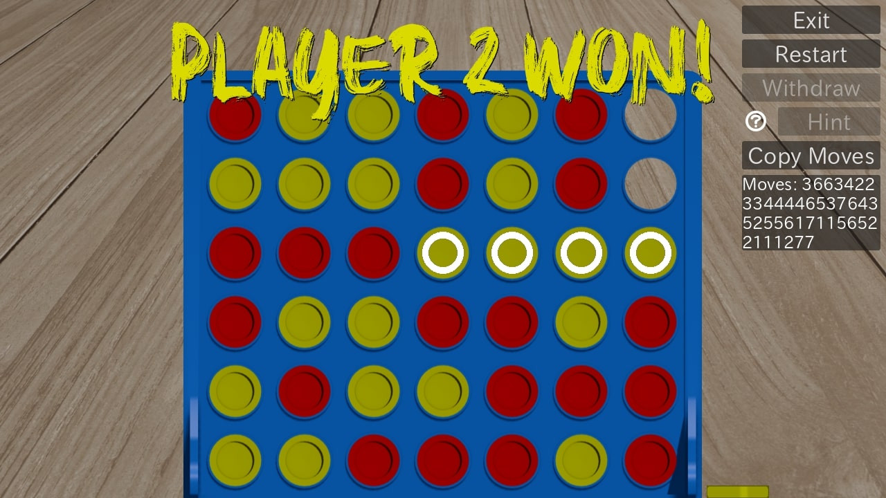 Connect Four, her kararın oyunun sonucunu etkilediği stratejik bir düelloya dönüşüyor. Arkadaşlarınızla oynayın, akıllı bir yapay zeka ile mücadele edin veya bilgisayarların karşılaşmalarını izleyin. Zorluk seviyesini ayarlayın, taktikler deneyin, hamleleri geri alın ve pozisyonu değerlendirmek için ipuçlarını kullanın. "İmkansız" modda, mükemmel stratejiyi hesaplayabilen profesyonel bir algoritma sizi bekliyor. Mantığınızı geliştirin, kazanın ve yeteneklerinizi kanıtlayın.