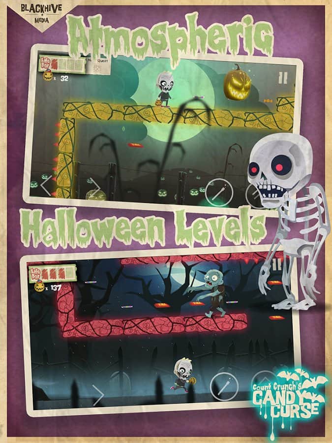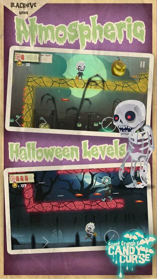 Count Crunch'un Şeker Laneti - Cadılar Bayramı için özel olarak yapılmış harika bir platform oyunu. Onu başka herhangi bir zamanda da oynamak mümkün, bu oyunu daha kötü yapmaz. Korkutucu bir iskelet maskesi takan bir çocuğu kontrol edeceksiniz. Farklı seviyelerde koşuyor, şekerler ve tatlılar topluyoruz. Yolda karşılaştığınız canavarlara yeşil bir şeyle saldırın. Çok dikkatli olun, oyunda çeşitli tehlikeli tuzaklar, dikenli hendekler ve daha fazlası var. Hayalinizdeki nesneye, taşınabilir bir oyun konsoluna ulaştığınızda özel bir sevinç yaşanır. Çıkartma toplayın ve çeşitli bonuslar kazanın.
