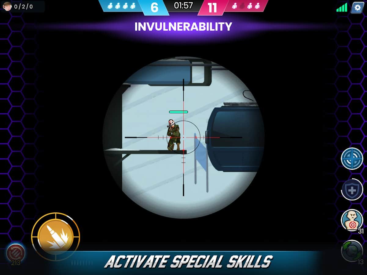 Countersnipe – dinamik bir aksiyon oyunu, ilginç 4'e 4 savaşlarla Android için. Bu oyunda, dünya istikrarının koruyucuları olan 'Aksiyom' ajanları ile yeni dünya düzeninin destekçileri olan 'Kaos' ajanları arasında geçen büyük bir savaşta yer alacaksınız. Diğer oyuncularla bir araya gelerek yenilmez ekibinizi oluşturun ve gerçek oyunculara meydan okuyun. Göreviniz haritayı keşfetmek ve rakiplerinizi avlayarak onları yok etmek olacak. Her oyun kendine özgü olacak, çünkü oyuncuların ortaya çıkışı rastgele gerçekleşecek. Silahları birleştirin, ajanları güncelleyin, gerekli unsurları ve zırhı etkinleştirin ve oyun tarzınızı oluşturun.
