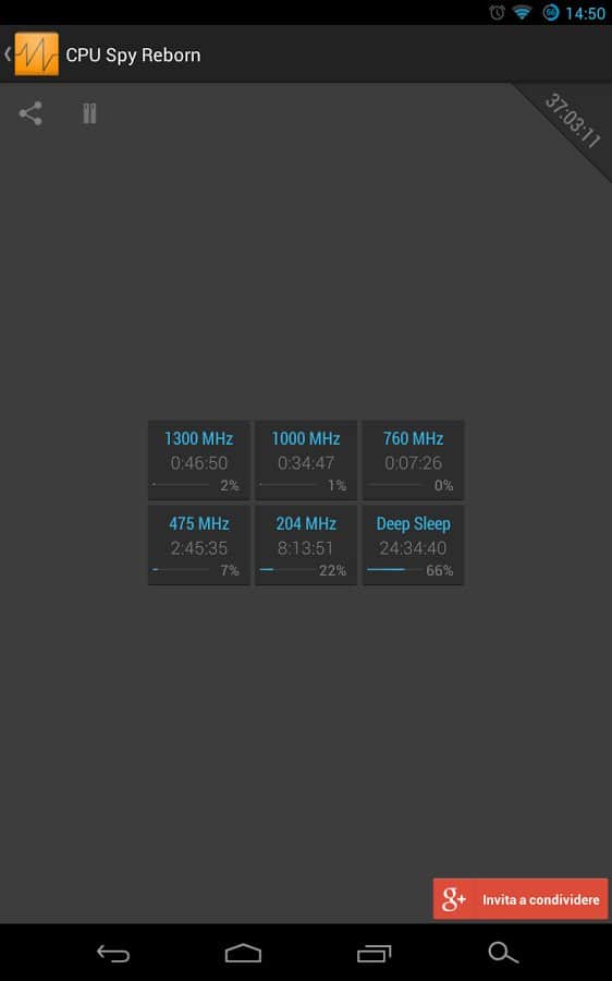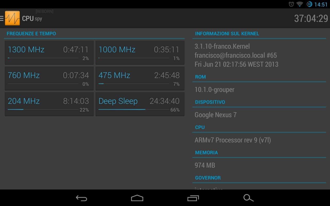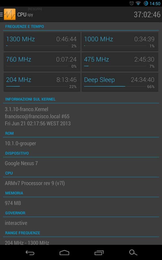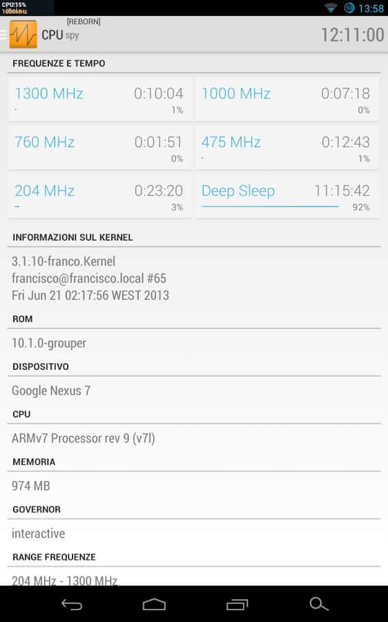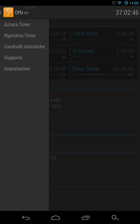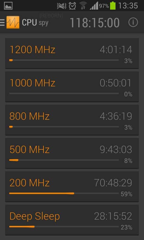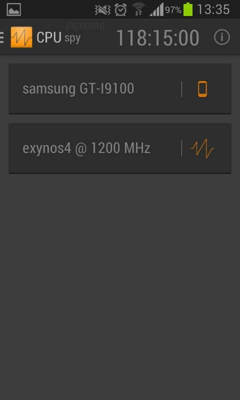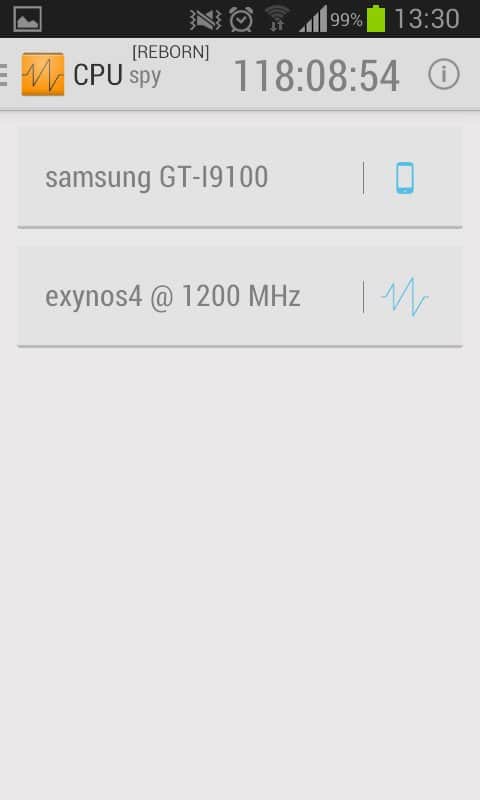 Mirko Dimartino tarafından geliştirilen CPU Spy Reborn, Android için. Android cihazınızın işlemci çalışma frekansını belirleyerek pil tasarrufu yapın. Hangi uygulamanın sürekli arka planda çalıştığını ve işlemcinin uyku moduna geçmesine engel olduğunu öğrenin. Ne yazık ki, hangi uygulamanın kaynak tükettiğini program göstermeyecek, bu nedenle suçluyu manuel olarak aramak zorunda kalacaksınız. Ancak CPU Spy Reborn'ın ana ekranında, farklı frekanslarla 13 sensör yardımıyla sistem yükünü göreceksiniz. Kullanım yüzdesini gösteren bir zamanlayıcı ve ilerleme çubuğu ile. İyi kullanımlar.