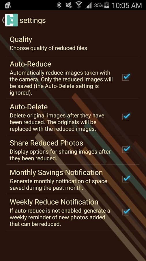 - Uygulama aracılığıyla fotoğrafın orijinalinin cihazın Galerisi'nden silinmesi için otomatik ve manuel ayarlar