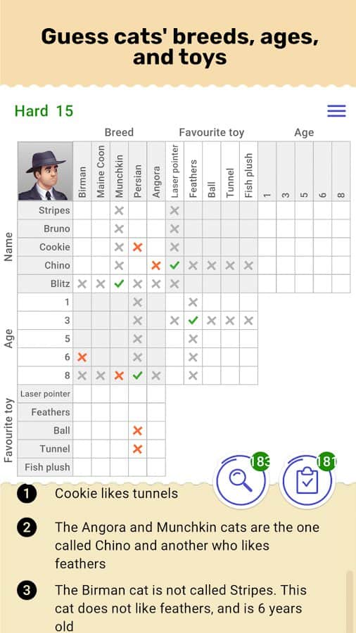 Mantık, beyninizi maksimumda çalıştırarak gelecekte gizli ipuçlarını bulmayı ve diğerleri için yüksek zorluk seviyesi nedeniyle imkansız olan bütün bulmacaları çözmeyi çok daha kolay hale getirir. Bulduğunuz tüm anahtarları çözümü aramak için kullanın, seviyeleri geçin ve her seferinde oyunları başarıyla kazanarak zihninizi geliştirin. Her bulmacanın hikayesindeki ipuçlarını takip edin ve hazırlanmanız gereken zorlu görevlerle karşılaşmaya hazır olun, tüm çözüm yollarını dikkatlice düşünün.