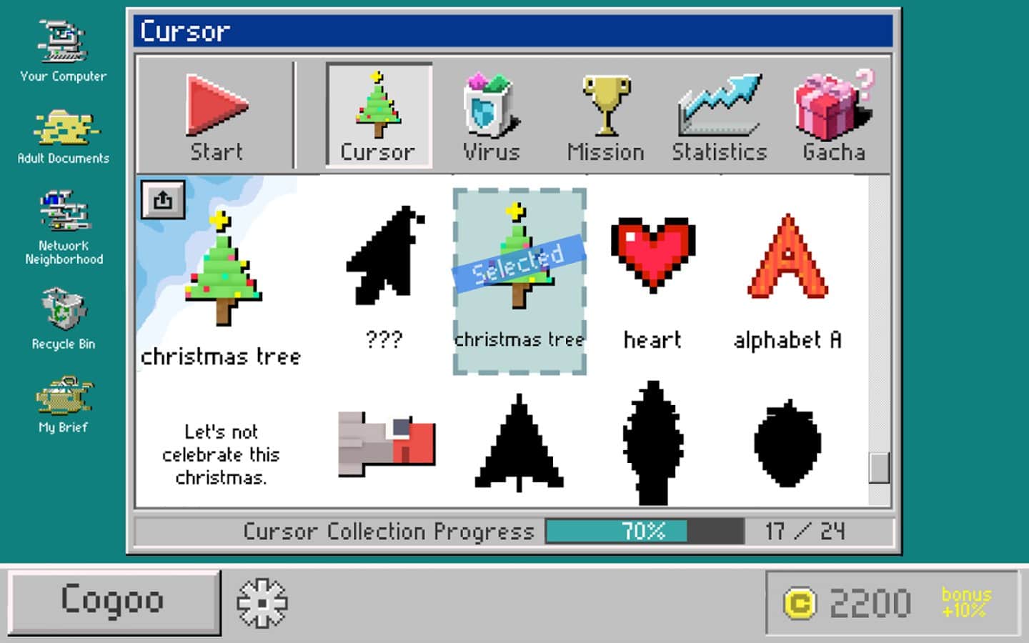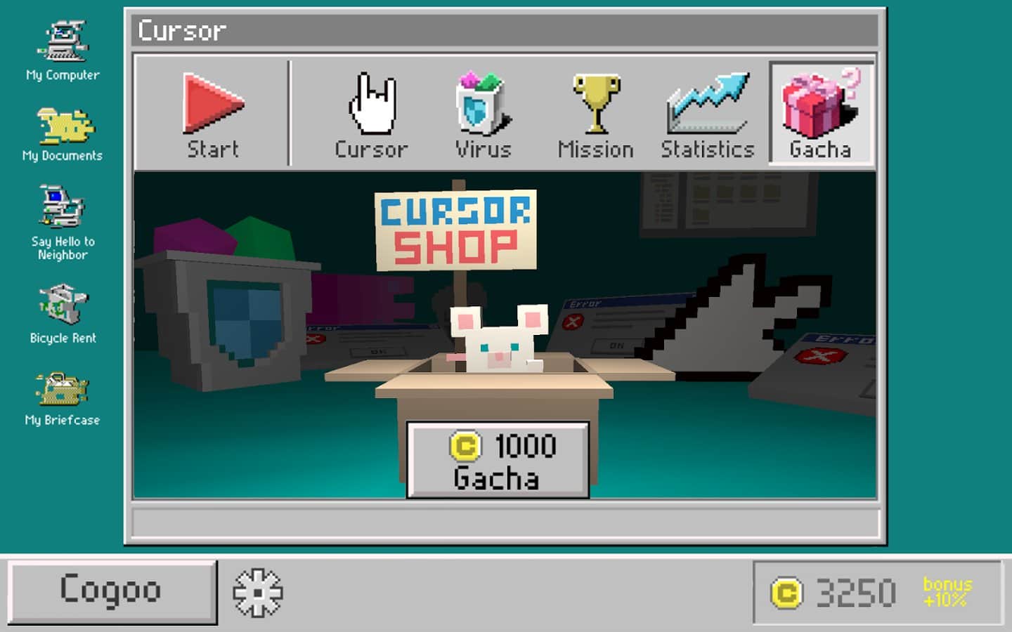 Kursor: Virüs Avcısı - kursoru yönetin ve sistem hataları da dahil olmak üzere çeşitli hataların avını görün. Sıklıkla olduğu gibi, bilgisayarınız virüs kapmış ve normal çalışması için onları ortadan kaldırmak için tüm gücünüze ihtiyacınız var. Normal fare imleci tüm virüslere, truva atlarına ve diğer zararlı yazılımlara karşı savaşıyor. Bunu zamanında yapmazsanız, işletim sistemi bu kadar çok arıza nedeniyle basitçe kapanır. Oyunda kursorla yazılım arayüzlerinde uçar gibi hareket edecek ve virüsleri bulacaksınız. Kontrol etmek 5 kuruş kadar basit. Ekrana tıklıyoruz - kursor yukarı kalkıyor, bırakıyoruz - aşağı iniyor.