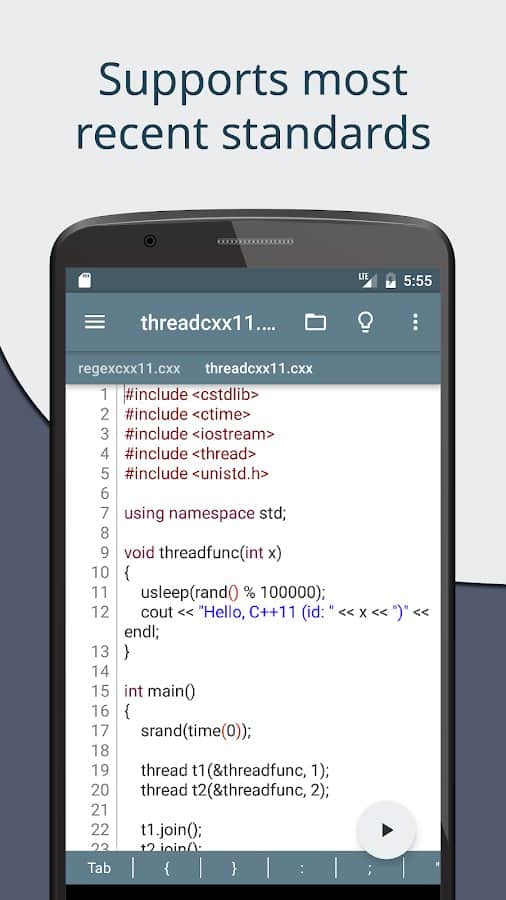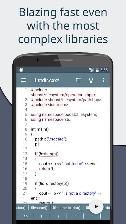 Cxxdroid - C/C++ derleyici IDE - Mobil cihazınızda C ve C++ dilini kullanma becerilerini kolayca ve hızlı bir şekilde öğrenin. Uygulama içinde çalışmak için gerekli olan her şey mevcut: Boost, SQLite, ncurses, libcurl, SDL2, SFML, Allegro ve daha fazlası. Gerçek zamanlı olarak mevcut olan işlevler, otomatik girinti tahmini yapma ve gerçek bir IDE gibi kod analizi yapma imkanı sunduğundan, işinizde size tekrar tekrar yardımcı olabilir. Ana özellik, C++ ile programlama için gerekli sembollerle donatılmış büyük bir klavye paneline erişiminizin olmasıdır.