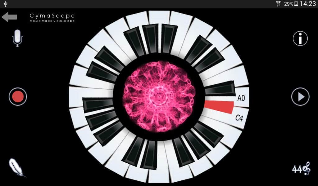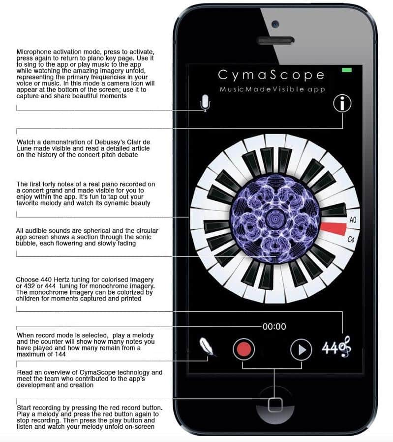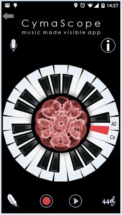 CymaScope - Müzik Görselleştirildi - Müziğinizi görünür kılın! Bu uygulama ile piyanoda çalarken müziğiniz ekranın ortasında görüntülenecek. Bu çok basit çalışıyor, belirli bir nota için belirli bir renk ve şekil atanmış. Ve çaldığınızda bunlar hızla değişerek birçok rengin eğlenceli bir resmini oluşturuyor.