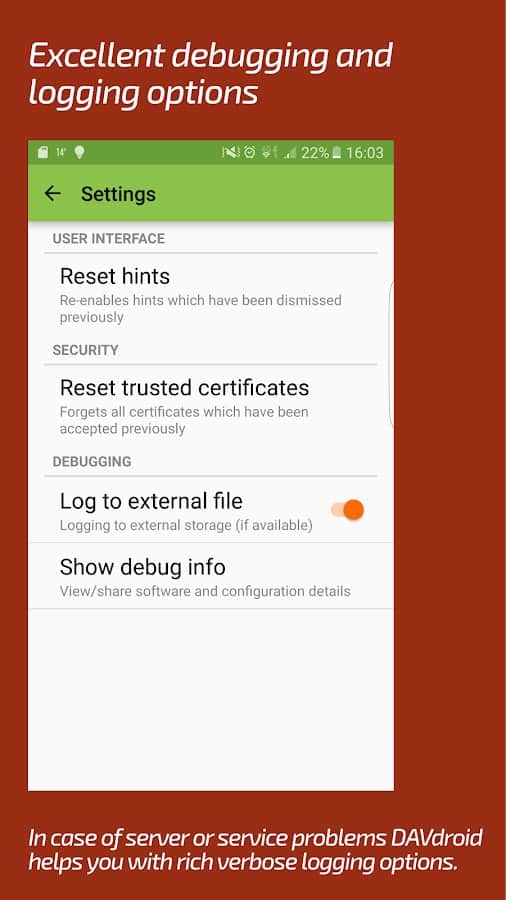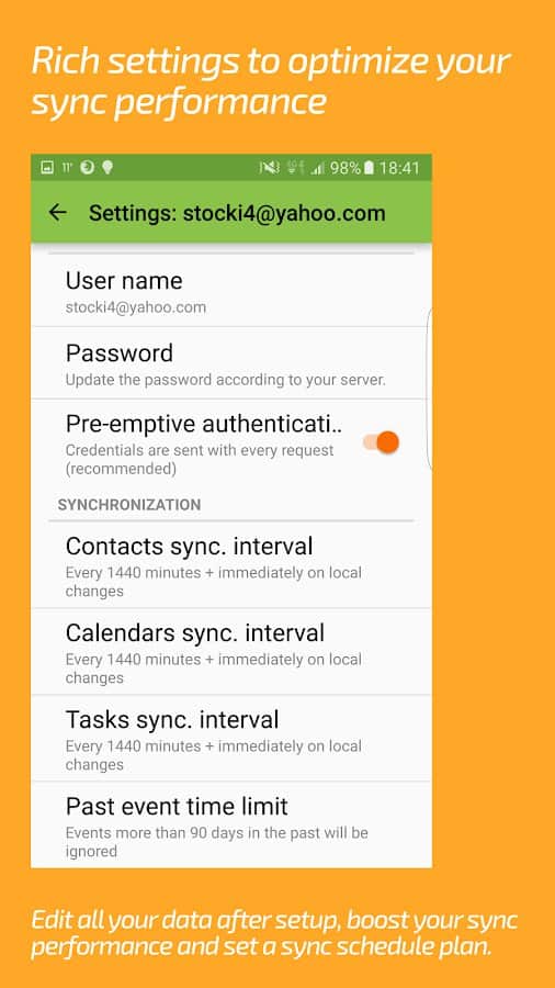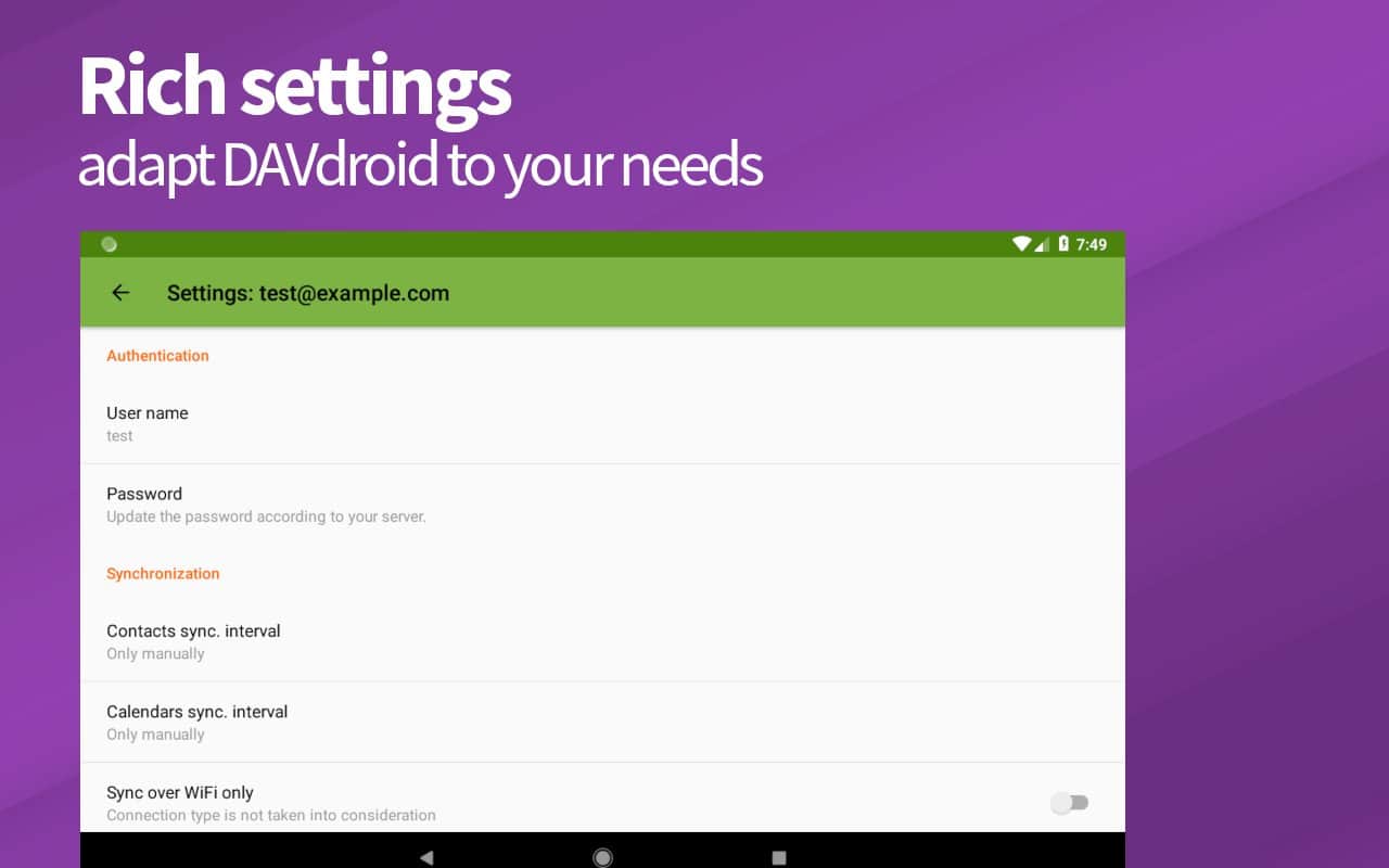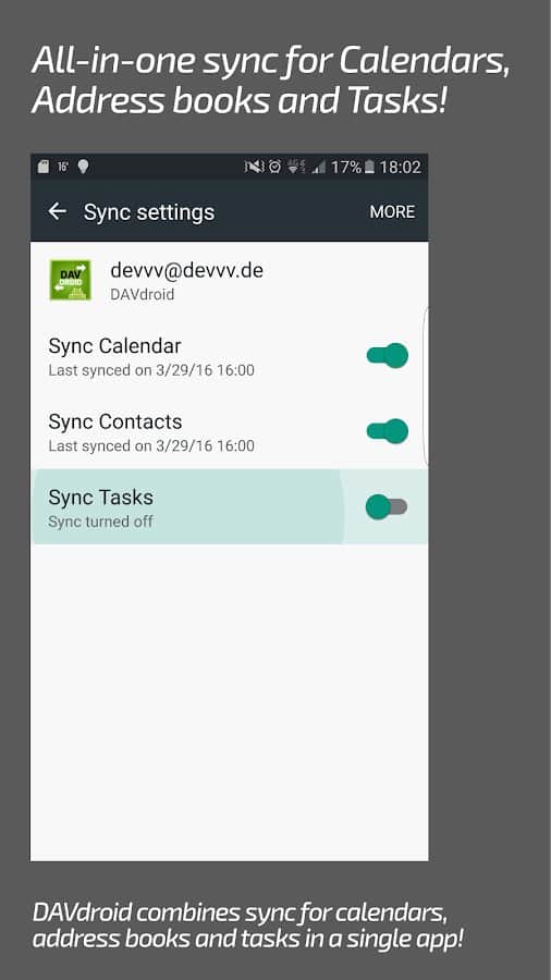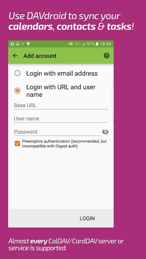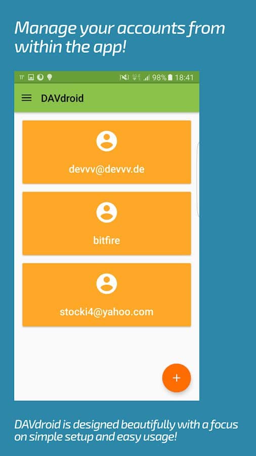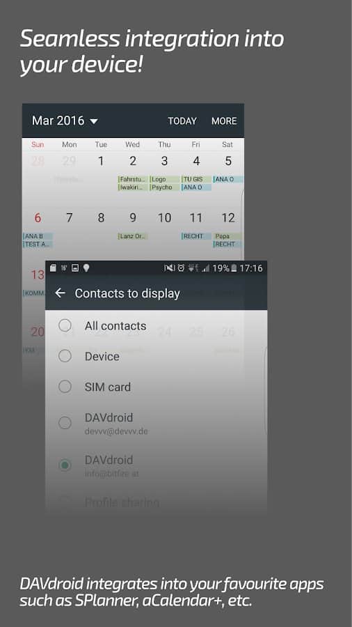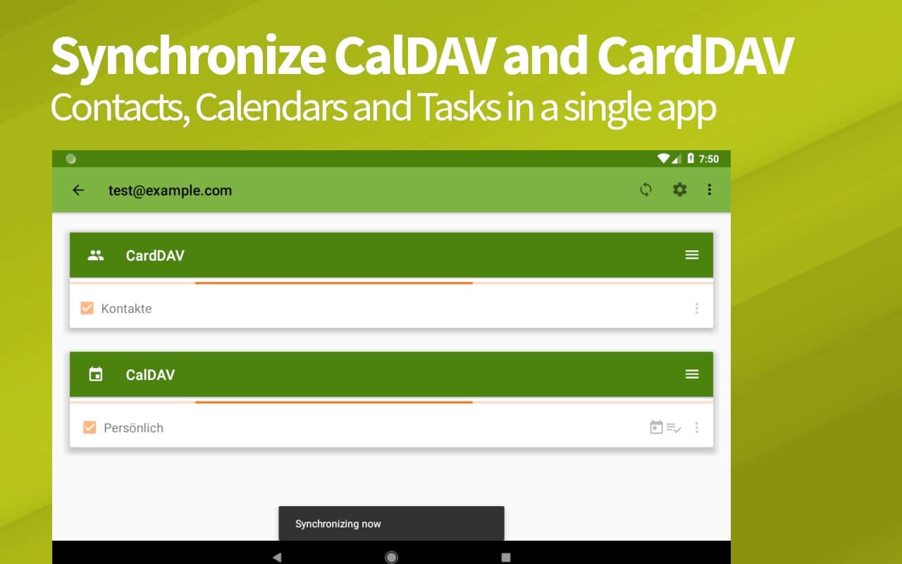DAVx⁵ (DAVdroid) – CalDAV/CardDAV Senkronizasyonu - sadece kişiler ve planlanan işler değil, aynı zamanda takvimler, görev planlama ve daha fazlası için sorumlu olan uygulamaları da senkronize etmenizi sağlayan kullanışlı, fonksiyonel ve basit bir uygulamadır. Bu projenin hem çevrimdışı hem de çoğu çevrimiçi hizmet ve kaynaklarla çalıştığını belirtmek gerekir. Diğer üçüncü taraf uygulamalarla senkronizasyon da herhangi bir zorluk yaratmayacaktır.