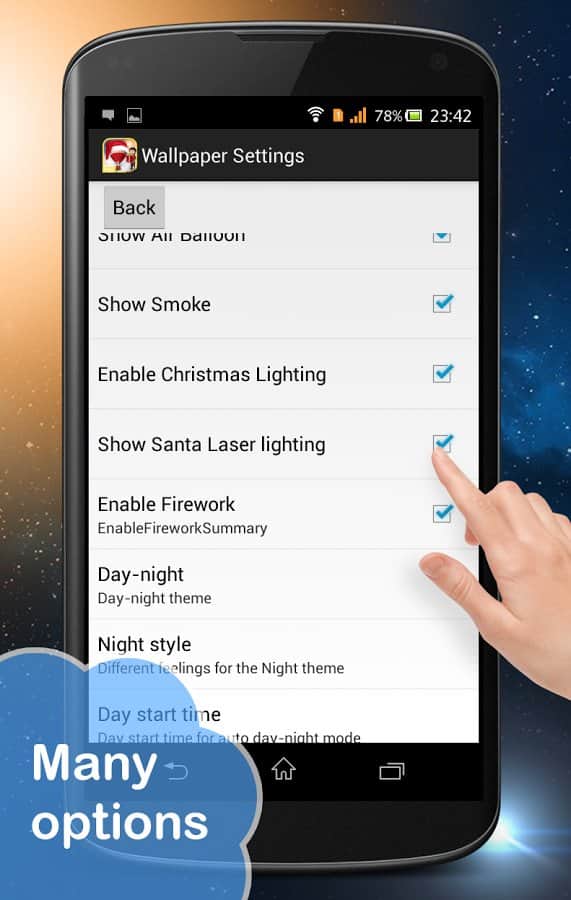 Gündüz Gece Noel Canlı Duvar Kağıdı 2015 – Yakında yeni yıl ve Noel var. Umarız bu yeni yıl canlı duvar kağıtları birçok kişiye hitap eder. Canlı duvar kağıtlarının Android'de ortaya çıkmasından bu yana çok zaman geçti ve hala popülaritelerini artırıyorlar. Modern işlemcilerin gücü, canlı duvar kağıtları ile masaüstünüzün yavaşlamaması için yeterli. Canlı duvar kağıtları, dokunduğunuz yere tepki verir; dokunduğunuz yerde parlak ve renkli bir havai fişek gösterisi olur. Geri sayım sayacı kurabilir ve ilginç renk çözümleri ekleyebilirsiniz. Canlı duvar kağıtlarında, sahneleri gündüzden geceye değiştirme imkanı vardır.