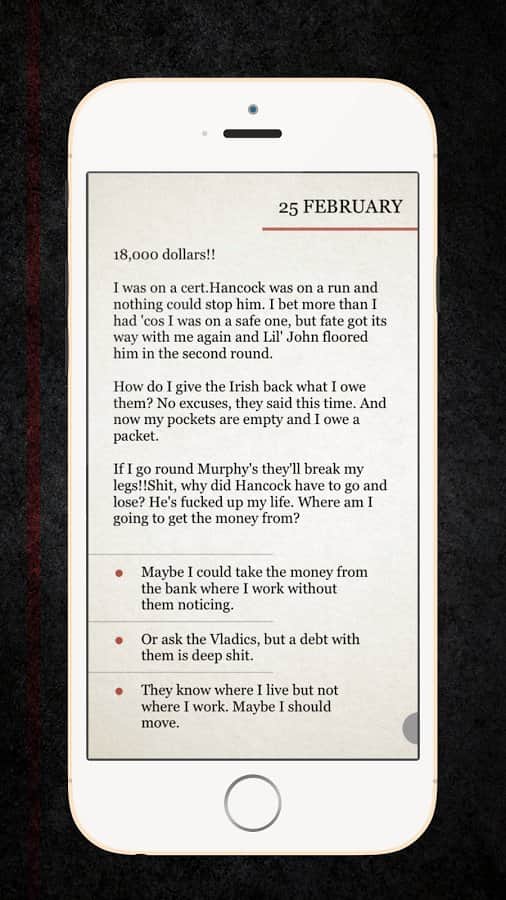 Ölümcül Günlükler - anlatı tarzında yapılmış etkileşimli bir metin macerasıdır. Oyun, şanssız bir banka çalışanı olan John Riggs hakkında, büyük bir miktar parayı kart oyununda kaybettikten sonra borcunu kapatma yolları aramak zorunda kalan bir adamın hikayesini anlatıyor. Elbette ki böyle bir durum, kahramanımızı şehrin en kötü yerlerine götürecek ve katılmak zorunda kalacağı olaylar, alışık olduğu şeylerden oldukça uzaktır.