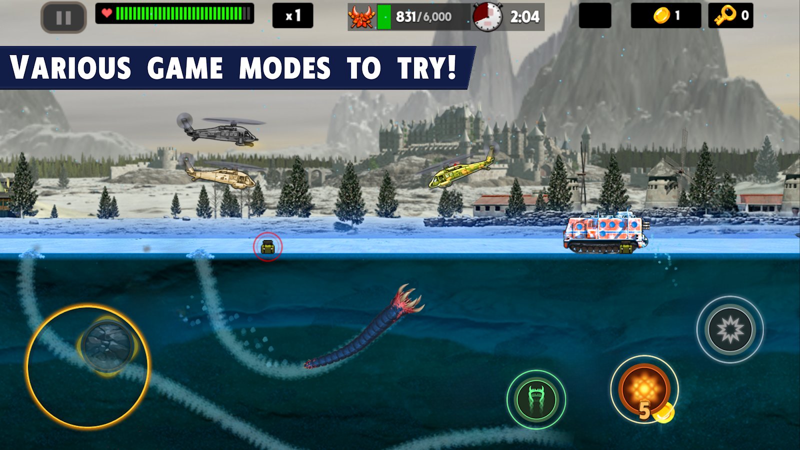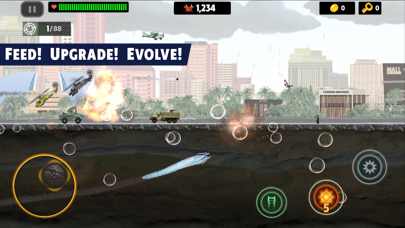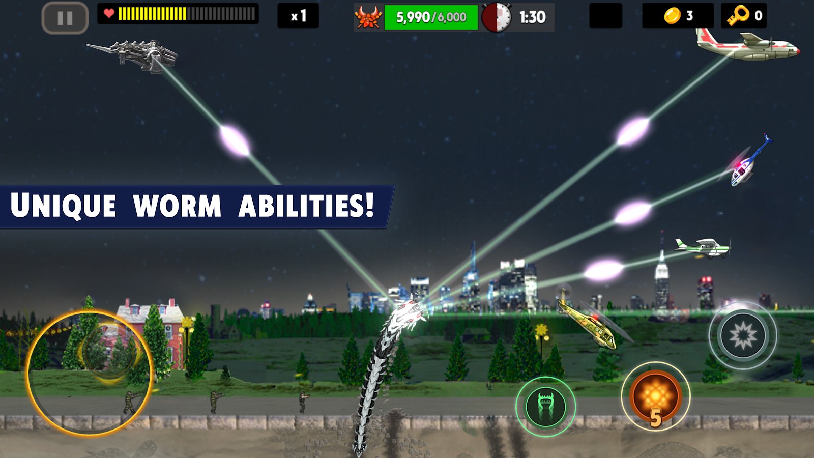 Ölüm Solucanı - Android'de yer altı canavarına hükmedin! Ölümcül solucanınız etrafındaki her şeyi yok edecek - askerlerin helikopterleri ve araçları sizin güçlü savaşçınızı durduramayacak! En beklenmedik anlarda yer altından fırlayın ve düşmanınızı alt edin! Hatta UFO'lar bile sizinle başa çıkamayacak! Kendinizi her şeyi yiyen bir solucan olarak gösterin, insanları yiyin ve uçakları sinir bozucu sinekler gibi düşürün! Sizi 45 seviye, 2 bonus oyun, 3 tür solucan ve 30 düşman tipi bekliyor. İlginç bir hikaye ve harika grafikler sizi etkisi altına alacak!