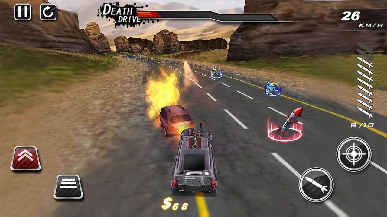 DeathDrive - Yıkım ve kıyamet temalı hareketli android yarışları. Kırsal yollarda makinelerle tam bir silah cephaneliği ile devasa yıkımlara katılın, makineli tüfekler, roketatarlar ve dikenler gibi silahlarla. Oyun ilerledikçe yolda bonuslar toplayabilir ve bunları yıkım için kullanabilirsiniz. Ne kadar çok yıkım yaparsanız, o kadar çok para kazanır ve modifikasyon için kullanabilirsiniz.