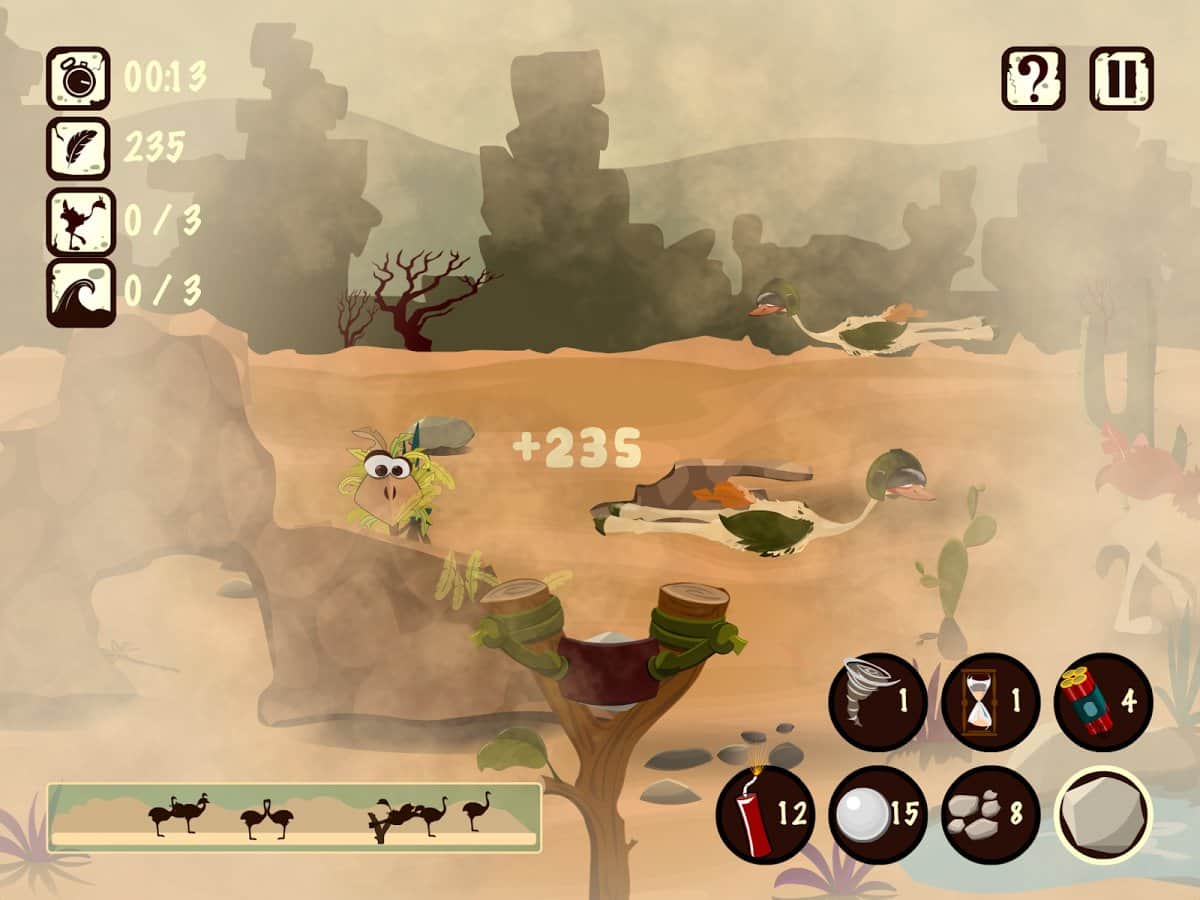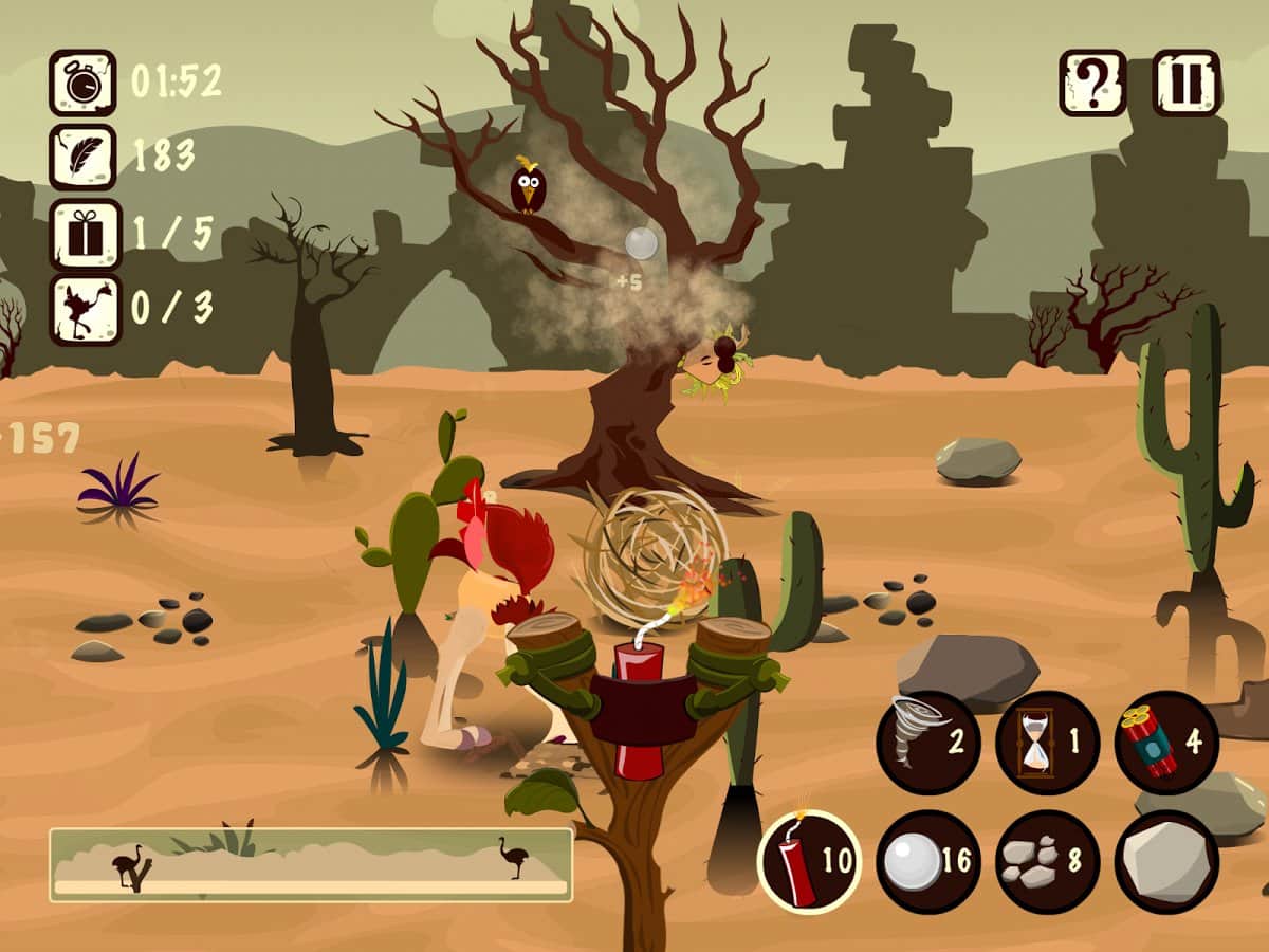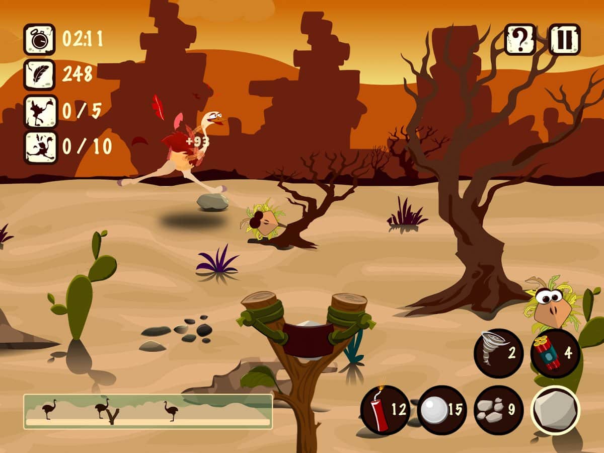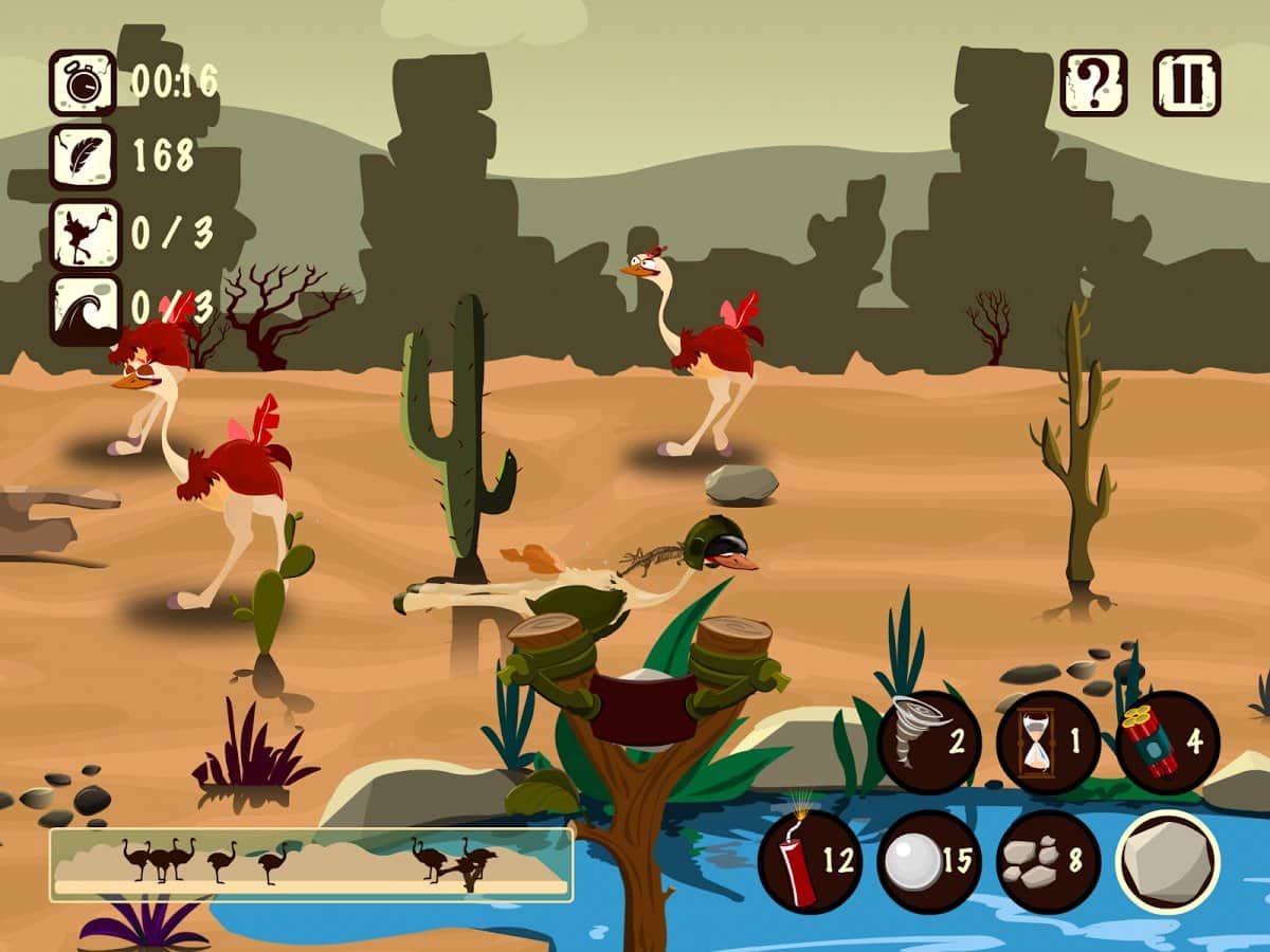 Çöl Avcısı - Çılgın safari - fillere, gergedanlara, kaplanlara ve aslanlara yerine devekuşları ve diğer kanatlıları avlayacağımız alışılmadık bir safari. Tüfeğe ihtiyacımız yok, slingshot alıyoruz ve daha küçük kardeşlerimize nişan alıyoruz. Slingshot'u sadece taşlarla değil, dinamit, patlayıcılar ve kuşlar için tehlikeli diğer mermilerle de dolduruyoruz. Mini haritaya bakarak, her zaman nerede ve hangi yönden bir sonraki avı bekleyeceğinizi bileceksiniz.