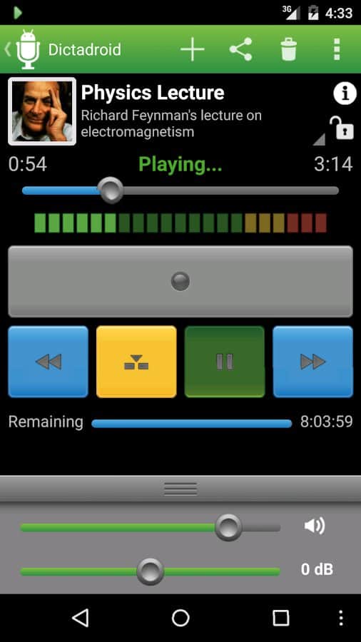Dictadroid Ses Kaydedici - bu uygulama ile cihazınızı profesyonel bir diktafon olarak kullanabilirsiniz. Dersleri, önemli toplantıları ve iş anlarını, müziği ve diğer sesleri kaydedin. Kayıtları e-posta, MMS, FTP, Google Drive veya Dropbox üzerinden paylaşın. Temel özellikler: