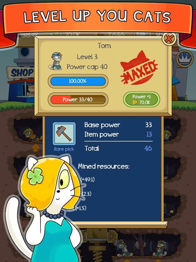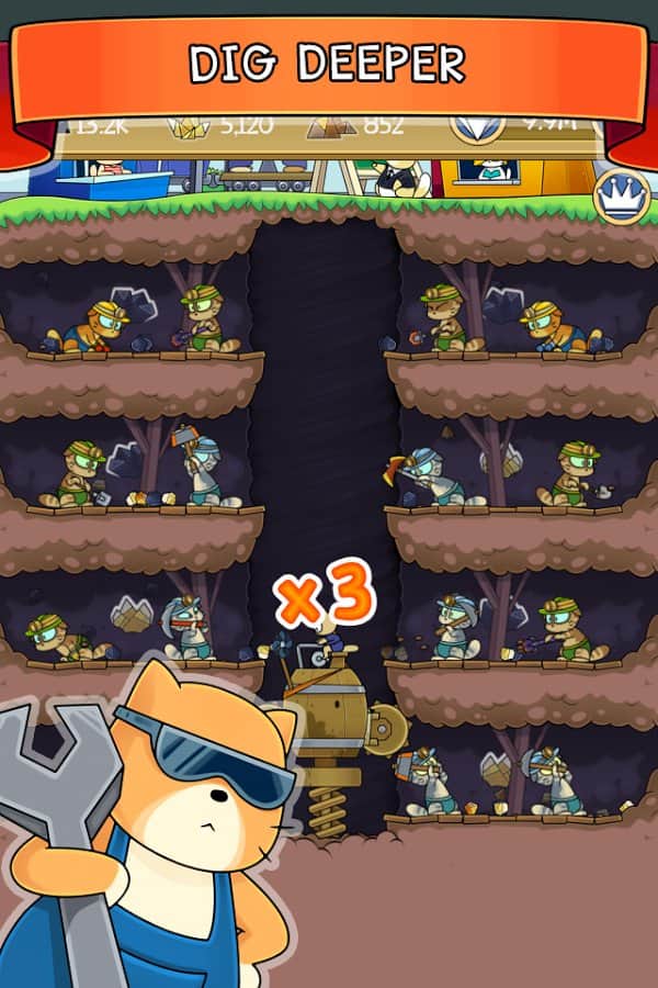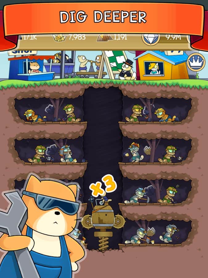 Kaz! - kedi madeni, kontrolünüz altındaki küçük bir madeni yöneteceğiniz bir Android tıklama oyunudur. Bu oyunda, eğlenceli kedilerin çalıştığı bir madeni yöneteceksiniz. Telefonunuzun veya tabletinizin ekranına olabildiğince sık tıklayın ve kedilerinizi mümkün olan en hızlı şekilde çalışmaya zorlayın ve yer altına daha da derinlemesine dalmalarını sağlayın. Değerli madenleri çıkarın ve bunları iyi paralar karşılığında satın, kazançlarınızı kullanarak kedilerin işini kolaylaştıracak faydalı makineler edinin ve ayrıca madeninizin verimliliğini artırmak için birçok güçlendirme edinin. Yeni kedileri işçi olarak alarak madeni genişletin.