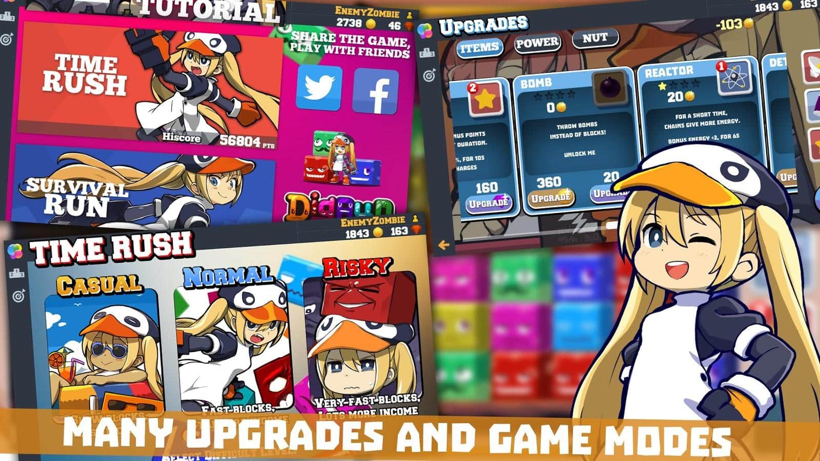 DigRun – Android için bir bulmaca oyunu, burada küpleri sıraya dizip sahadan kaldırmanız gerekiyor. Bu oyunda küçük bir kıza yardımcı olacak, çok renkli küpleri toplayacak ve onlara özel bonuslar kullanarak vurmaya çalışacaksınız. Sahadan yeterince blok kaldırarak, blokları daha hızlı yok etmenize yardımcı olacak güçlü yetenekleri aktive edebilirsiniz. Oyunda altı renk küp bulunmaktadır ve her biri farklı bir güç taşır, onları kırdığınızda tüm gücü serbest bırakmış olursunuz. Sevimli karakterlerle birlikte oynayın ve canlı grafiklerin ve animasyonlu küplerin tadını çıkarın.