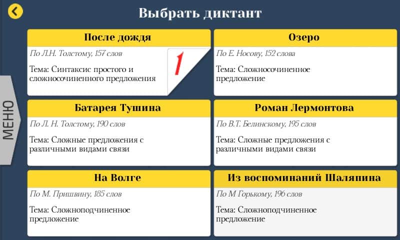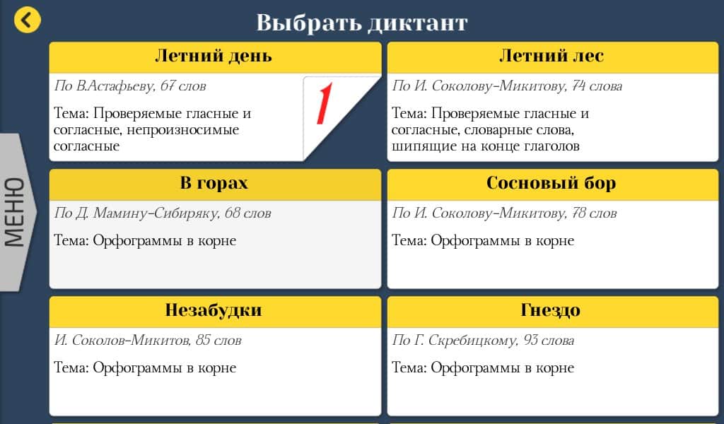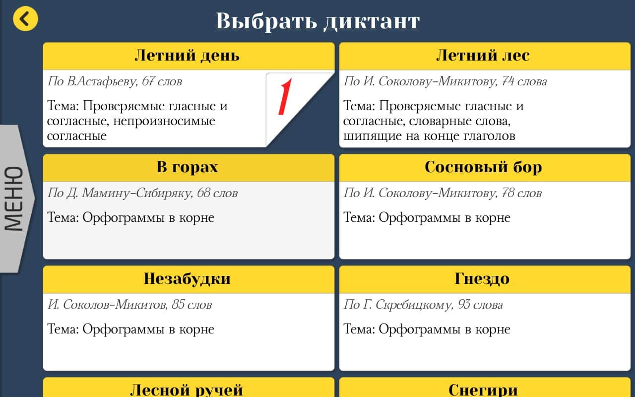 Dikte. Rusça - Bir sonraki dikte kapıda mı? Kendinize güvenmiyor musunuz? O zaman bu uygulama bilgilerinizi ve yazım becerilerinizi kontrol etmenize ve bir sonraki dikteye başarıyla hazırlanmanıza yardımcı olacaktır. Tüm metinler klasik Rus eserlerinden alınmıştır ve okul programına uygundur. Uygulamanın arayüzü basit, hatta birinci sınıf öğrencisi bile kolayca anlayabilir. Dikteler sınıflara göre ayrılmıştır, ilkokul (1-4. sınıf) için metinler daha basit, 5-7. sınıflar için dikte doğal olarak daha zor olacaktır ve 11. sınıfa kadar bu şekilde devam edecektir. Uygulamada, çalışmalarınız için notların verileceği bir günlük bulunmaktadır.