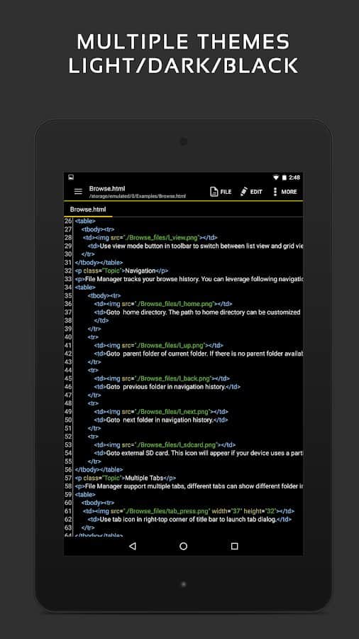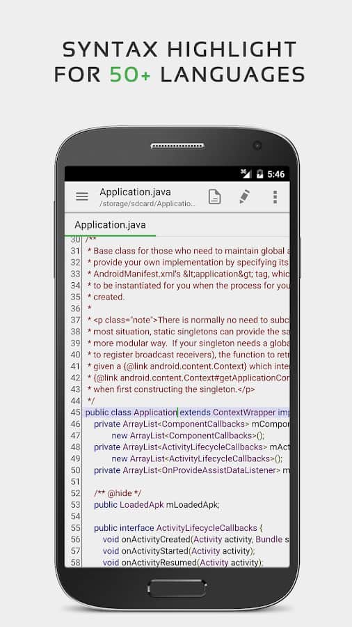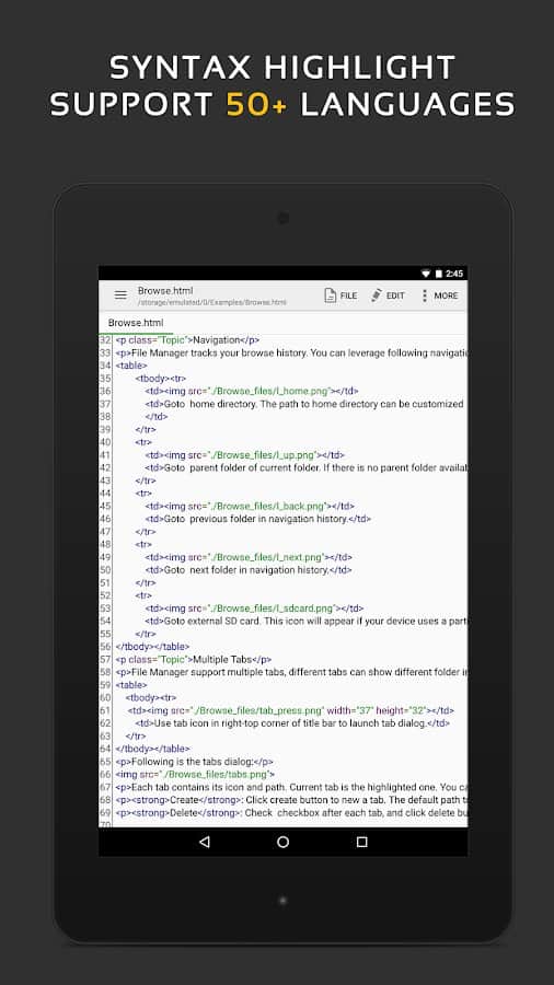 - 40'tan fazla programlama dili için kod düzenleyici ve sözdizimi vurgulama