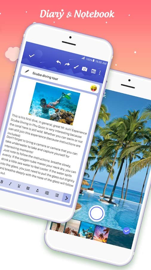 "Günlük ve Notlar" uygulamasında düşüncelerinizi güvenli bir şekilde saklayarak kaydedebilirsiniz. Notlar oluşturun, yapılacaklar listeleri hazırlayın, izlenimlerinizi ve düşüncelerinizi paylaşın. Tüm bunlar tek bir cihazda, istediğiniz zaman erişim ile. Programın sezgisel arayüzü herkesin hoşuna gidecek. Tek bir kayıt listesi tutabilir veya bunları kategorilere ve konulara ayırabilirsiniz. En değerli anılarınızı saklamak için resimler, etiketler, çıkartmalar ve alt yazılar ekleyin. Yeni bir not eklemek sadece birkaç saniye alır, diğer önemli işlerden de dikkatinizi dağıtmadan. Günlükte zamanında gerekli görevleri yerine getirmenize yardımcı olacak ayarlanabilir bildirim sinyalleri vardır. Günlüğünüzdeki veriler, başkalarının gözünden güvenli bir şekilde korunacaktır.